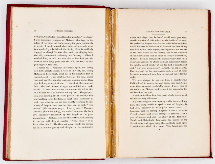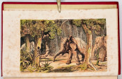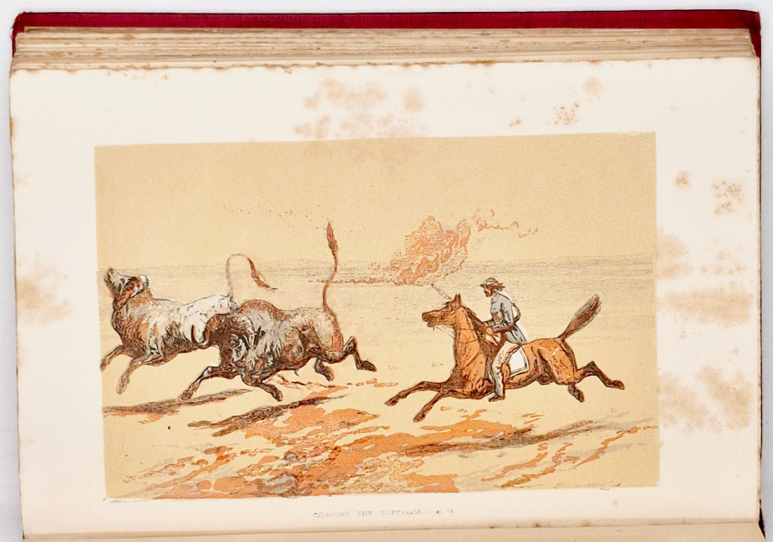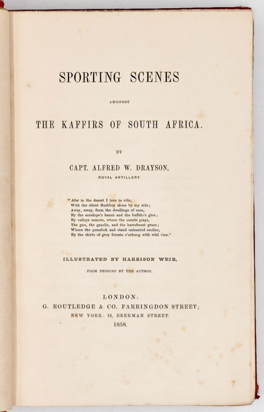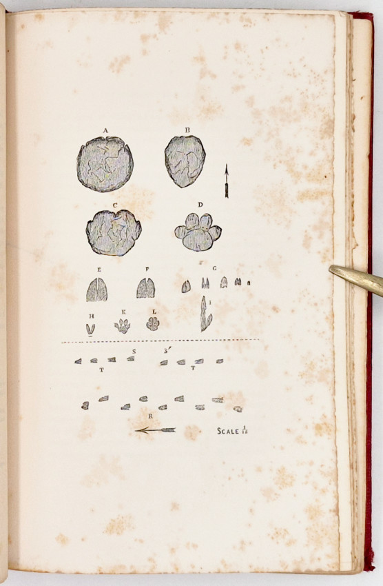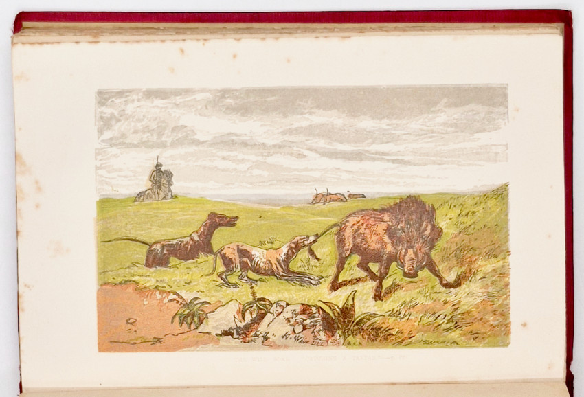 First Edition: 327 pages, double-tinted lithographic frontispiece and 7 double-tinted lithographic plates, 1 engraved plate of paw prints, original red straight grained cloth with a gilt vignette of an elephant on the upper cover and gilt decoration and titling on the spine - the cloth is frayed at the top and bottom of the spine, edges uncut, foxing on the plates and tissue guards - the lithographs are inked in brown with a heavy green overlay which makes them unusually vibrant but which causes the foxing on the tissue guards, the plates are generally described as chromolithographs (a technique involving the use of multiple lithographic stones) indicating many colours were used but in fact only two colours are employed, the front free endpaper is missing, bookplate on the front paste-down endpaper, a very good copy.
