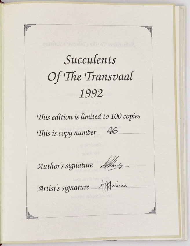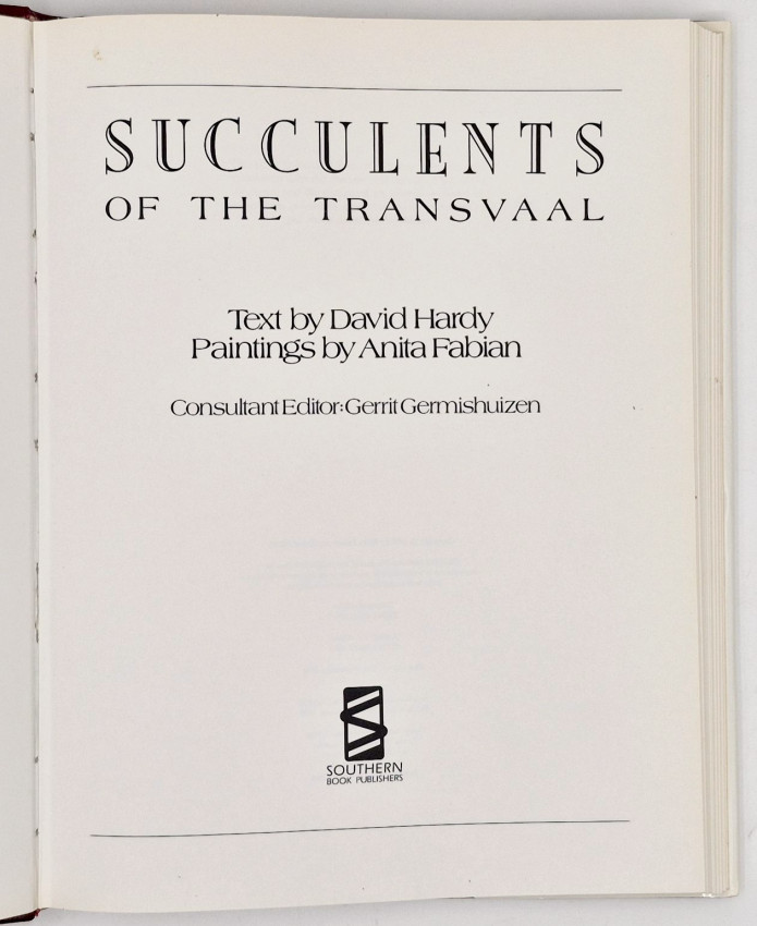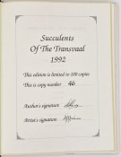 'The 56 colour plates illustrates over a hundred of the succulents that are to be found in the Transvaal. The text introduces each plant, with details about its distribution, appearance, the derivation of its name, alternative names by which it is known to local people and fascinating anecdotes about its discovery. The text and illustrations are on facing pages for easy reference.' Editor's note.