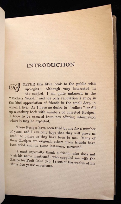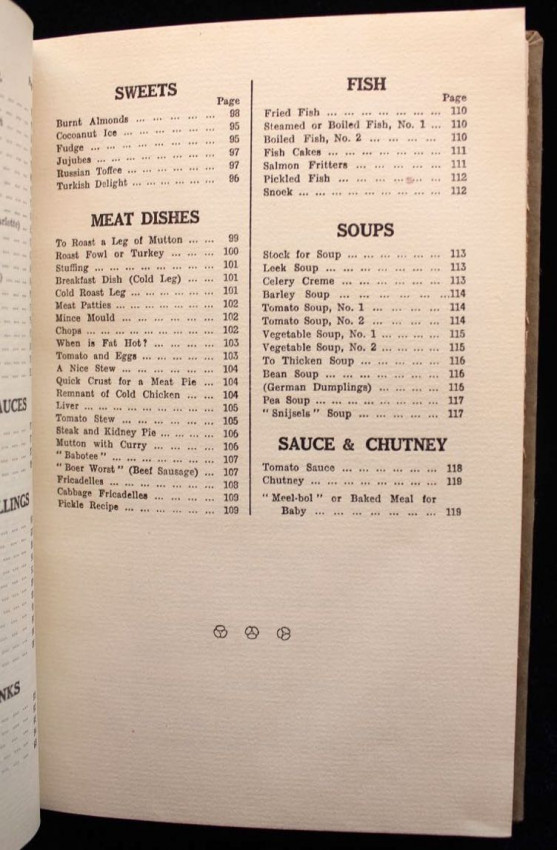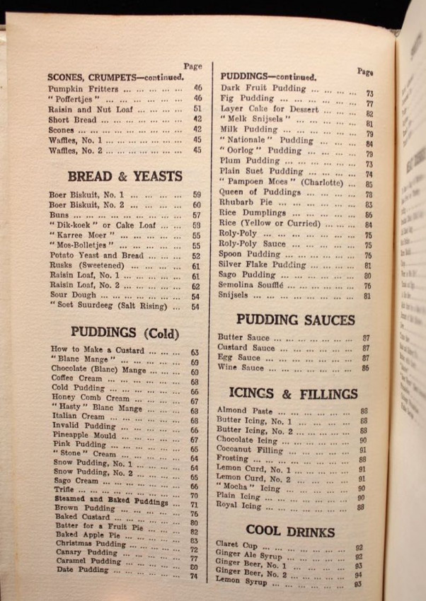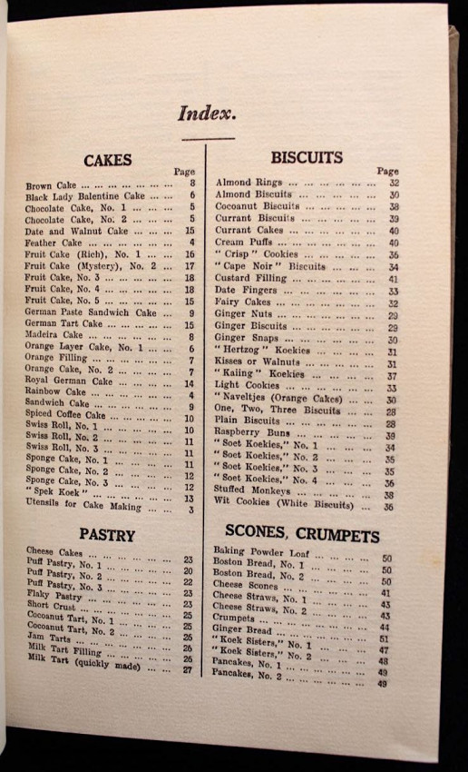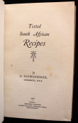 A scarce collection of vintage South African recipes for cakes, biscuits, pastry, scones & crumpets, bread & yeasts, puddings, pudding sauces, icings & fillings, cool drinks, sweets, fish, meat dishes, soups, sauce & chutney.
