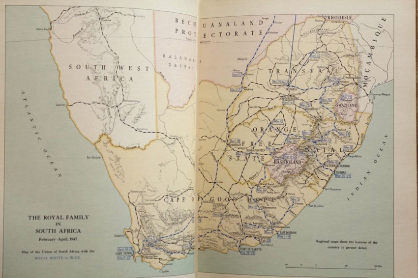 127pp. Illustrated with numerous black & white and colour photos. Colour map of South Africa in front and several route maps illustrating the Royal Family's itinerary of their famous visit to South Africa, which in 1947 was still a Union.