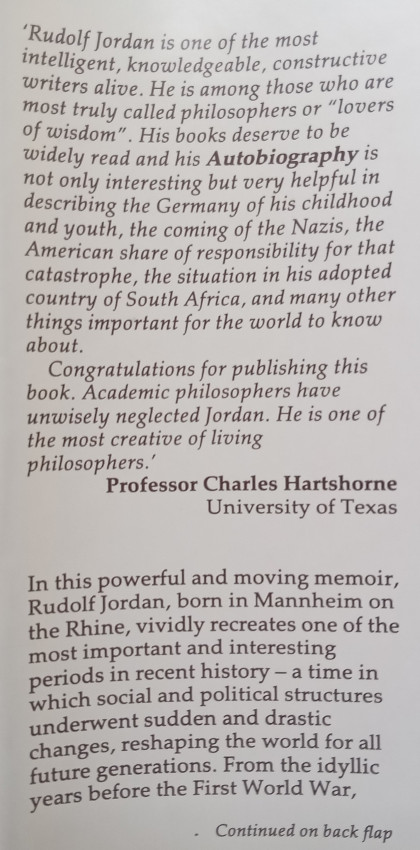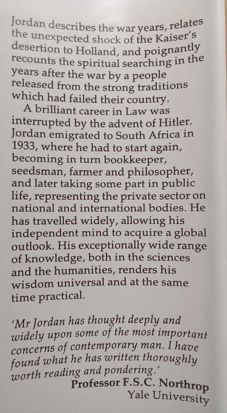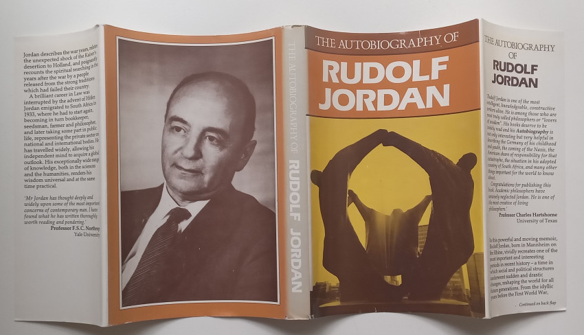 ‘In this powerful and moving memoir, Rudolf Jordan, born in Mannheim on the Rhine, vividly recreates one of the most important and interesting periods in recent history – a time in which social and political structures underwent sudden and drastic changes, reshaping the world for all future generations. From the idyllic years before the First World War, Jordan describes the war years, relates the unexpected shock of the Kaiser’s desertion to Holland, and poignantly recounts his spiritual searching in the years after the war by a people released from the strong traditions which had failed their country. Jordan emigrated to South Africa in 1933, where he had to start again, becoming in turn bookkeeper, seedsman, farmer and philosopher, and later taking some part in public life, representing the private sector on national and international bodies.’ (from synopsis on dust jacket of book)