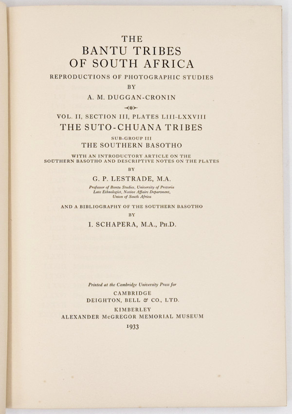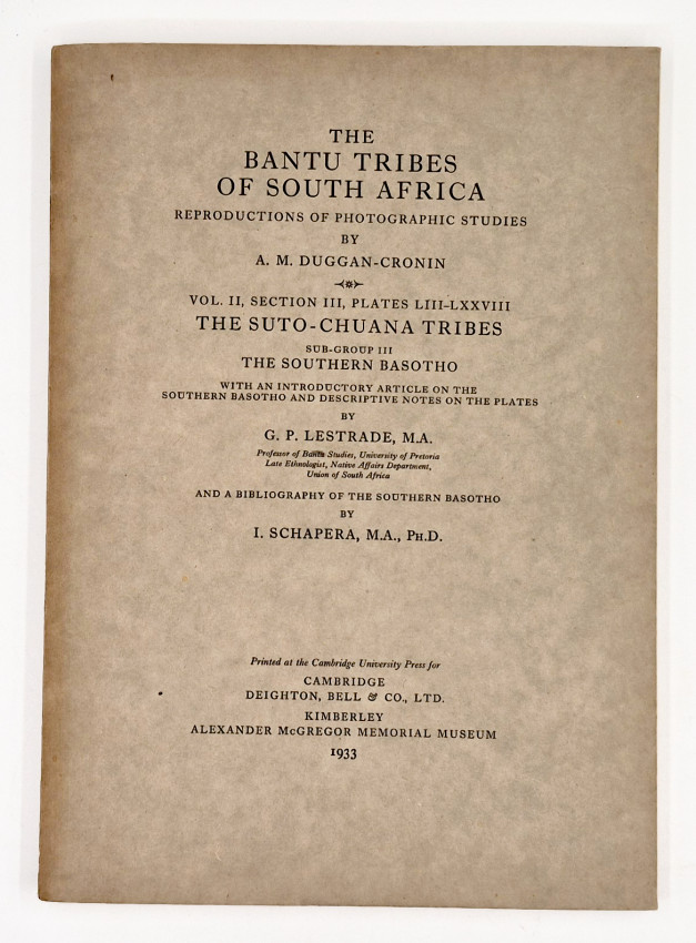 Vol. II, Section III, Plates LIII - LXXVIII. THE SUTO-CHUANA TRIBES. Sub-Group III THE SOUTHERN BASOTHO with an introductory article on the Zulu, a bibliography, and descriptive notes on the plates by D.McK. Malcolm. Text by G.P. Lestrade. 1933.