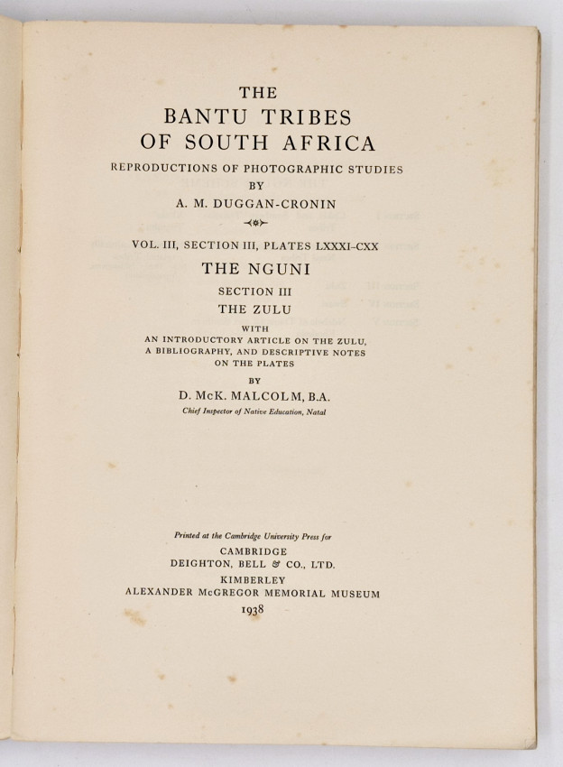 Vol. III, Section III, Plates LXXXI – CXX. THE NGUNI, Section III, The Zulu, with an introductory article on the Zulu,a bibliography, and descriptive notes on the plates by D.McK. Malcolm. 1938