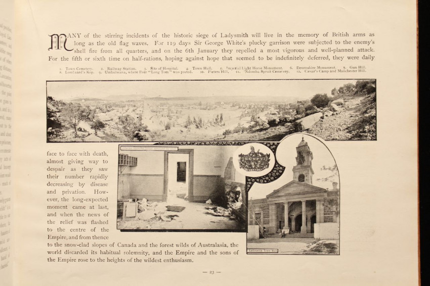 'It is stated that "the aim of the compiler of this work has been to present a series of views in continuity of district, with a brief and concise narrative of the operations of the Natal Field Force" (South African War, 1899-1902). It is claimed that the photographs are published for the first time, and that they give a more vivid representation of incidents and places of interest connected with the Natal campaign that can be met with in similar productions.' - Mendelssohn Vol. II, page 320-321