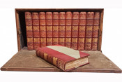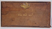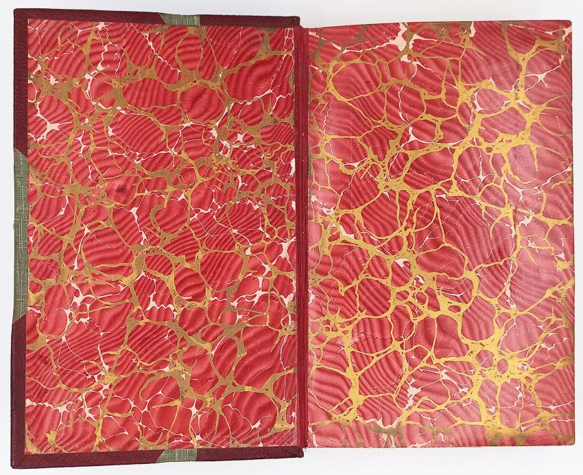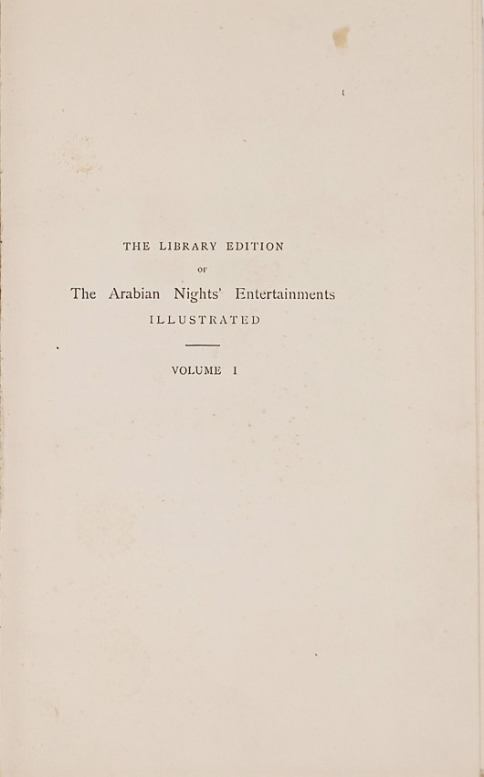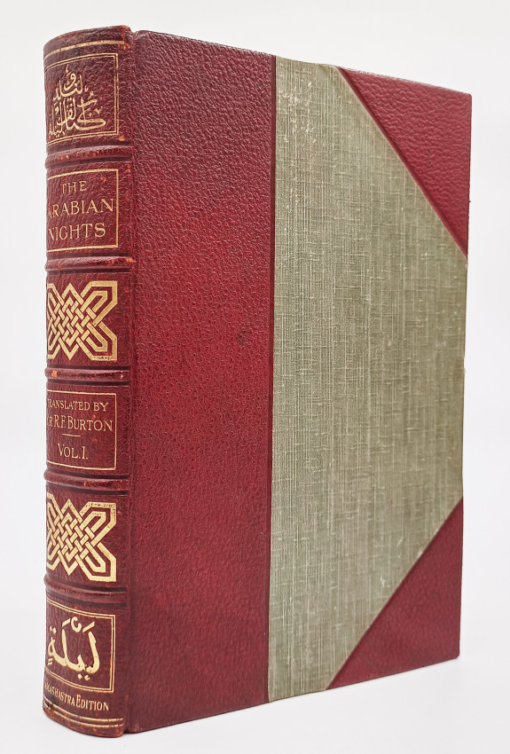 8vo (255 x 170 mm), bound in three-quarter red morocco, with green art linen sides, top edges gilt, others uncut, marbled endpapers and cloth hinges. Contained in a wooden case or 'casket' covered with olive green morocco and with a fold down front with the title in Arabic ( أَلْفُ لَيْلَةٍ وَلَيْلَةٌ ʾAlf Laylah wa-Laylah) and a lock (key is missing). The leather is now faded to brown and the leather on the back of the case is damaged with some loss. There is a nick in the leather at the top of the spine of volume XI.