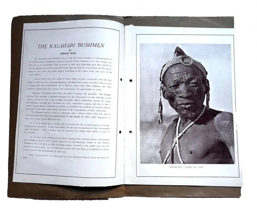 Donald Bain " travelled with ǂKhomani community members from the southern Kalahari to the Empire Exhibition in Johannesburg. This was an attempt to spread awareness about their plight as the land that they lived on had been declared The Gemsbok National Park in 1931, reducing their access to natural resources."