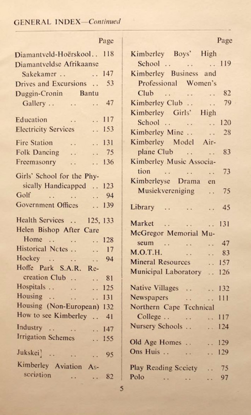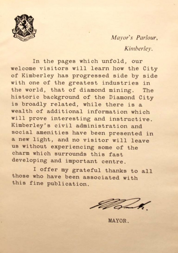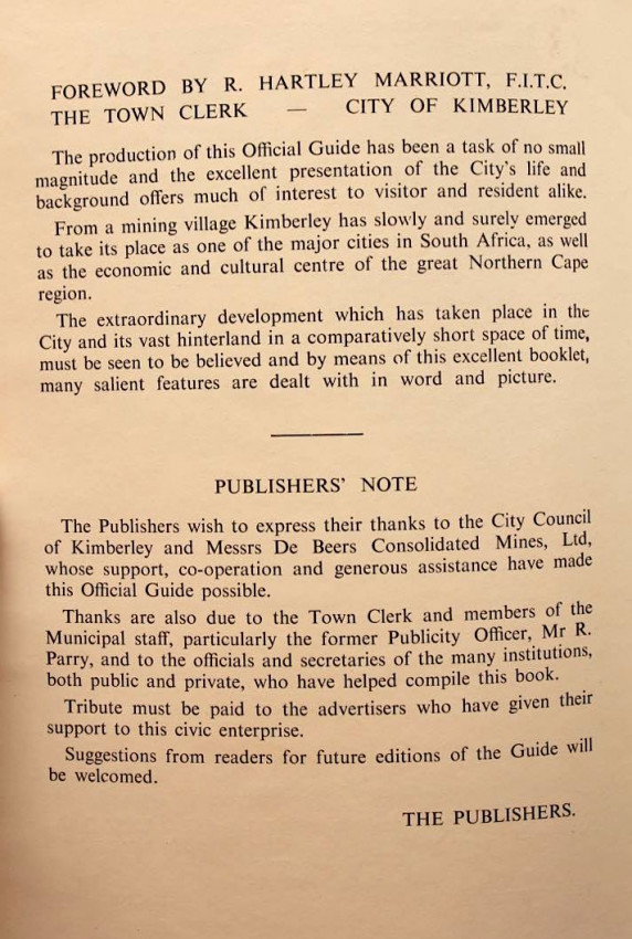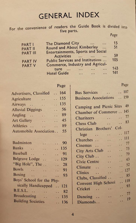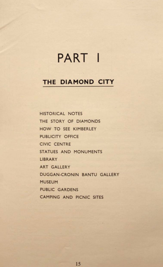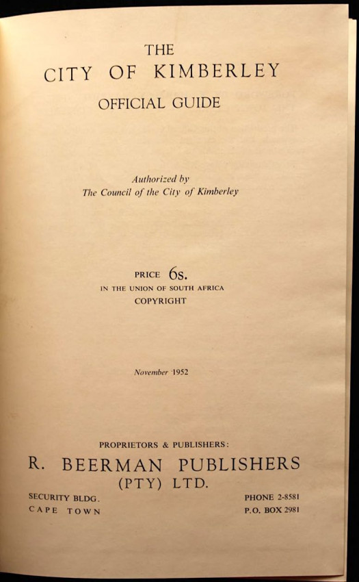 A vintage guide to the historical diamond-mining city. Includes sections on the history, mining, entertainments, sports and social activities, public services and institutions, hotels etc. that the city had to offer its visitors in the 1950's.