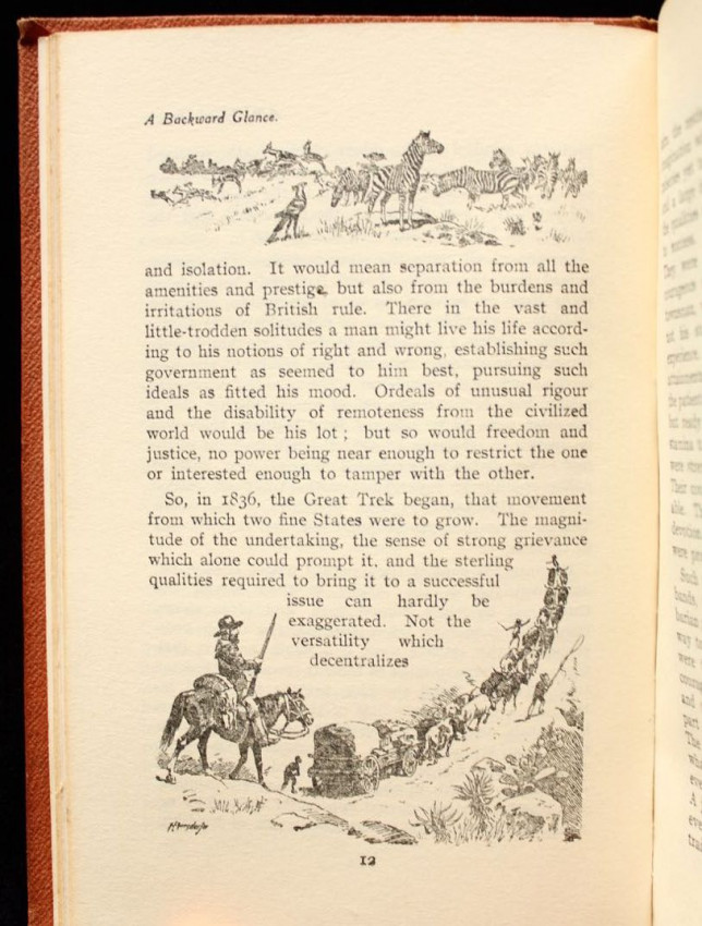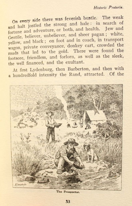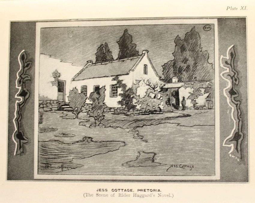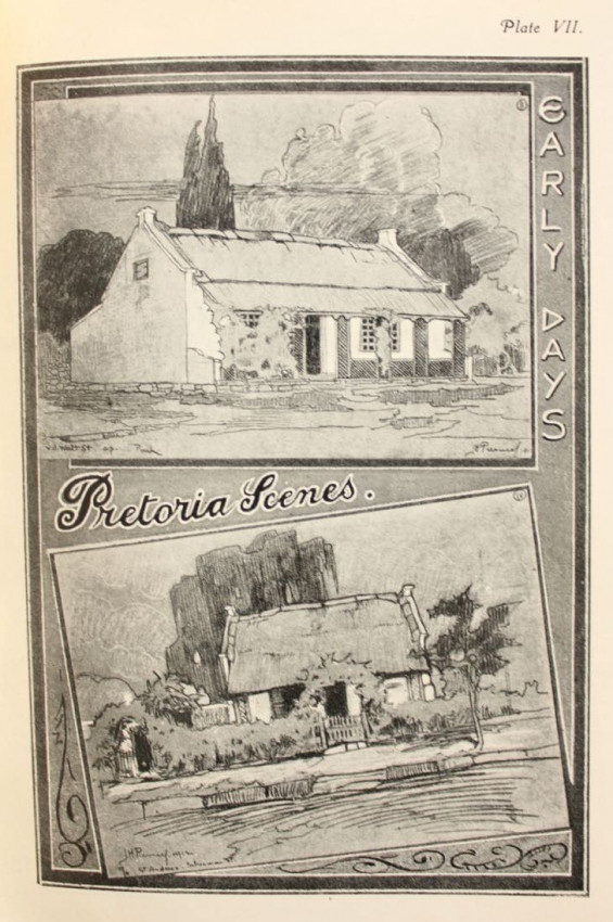 Of particular interest are the drawings furnished for this publication by a young J. H. Pierneef who later became South Africa's most sought after artist. These three plates are the earliest book illustrations done by him and are captioned as follows: Pretoria Scenes - Early Days, Old Pretoria Residences, Jess Cottage Pretoria - the scene of Rider Haggard's novel.