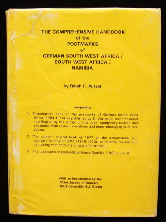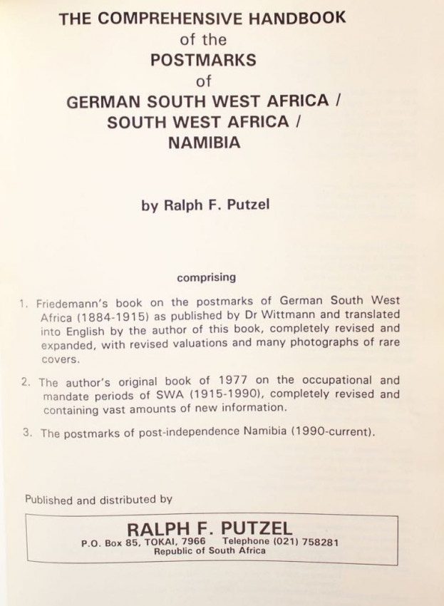 'This is the most comprehensive book yet issued on this subject, in fact being two books in one. In 600 pages Ralph Putzel not only updates the old Friedemann/Dr. Wittmann book with new valuations and many varieties not previously listed, but has also expanded the Mandate Period with many new discoveries, new information, Archive Records, additional postmarks, cachets & varieties, plus all the postmarks of the new Republic of Namibia, with its change of date stamps, such as the removal of lettering in stages, such as "SWA", postal codes, replacement cancellers, etc.