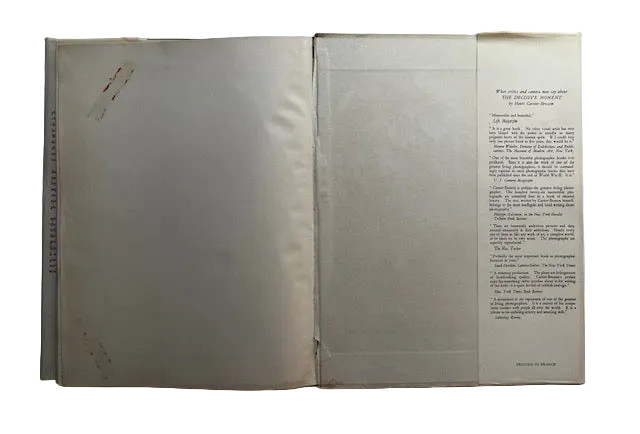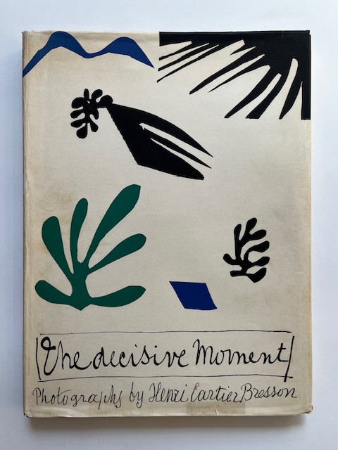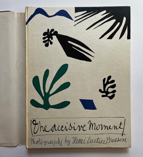 From the colophon: "This book, with a cover designed and executed especially for it by Henri Matisse, is a selection of 126 photographs from the work of Henri Cartier-Bresson. The French edition by Verve (Images a la Sauvette) and the American Edition by Simon and Schister (The Decisive Moment), were conceived and composed by Teriade with the collaboration of Marguerite Lang. The engraving and printing is the work of the master printers Draeger Freres of Paris. It was completed the 22nd of July, 1952."