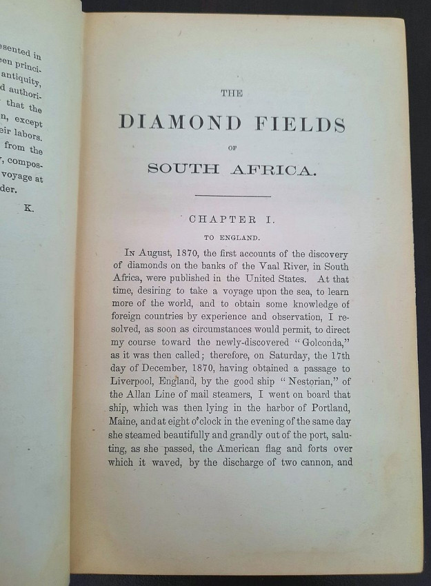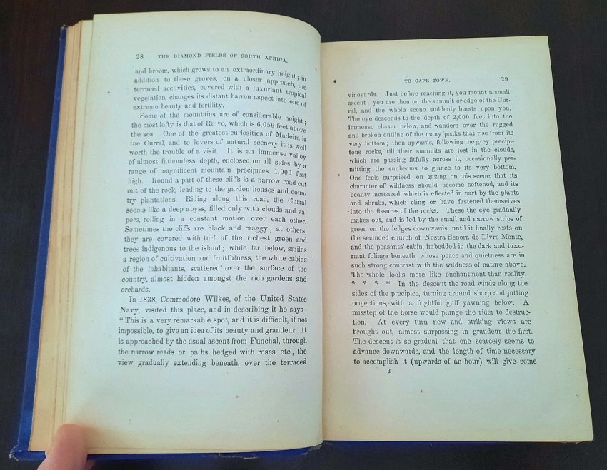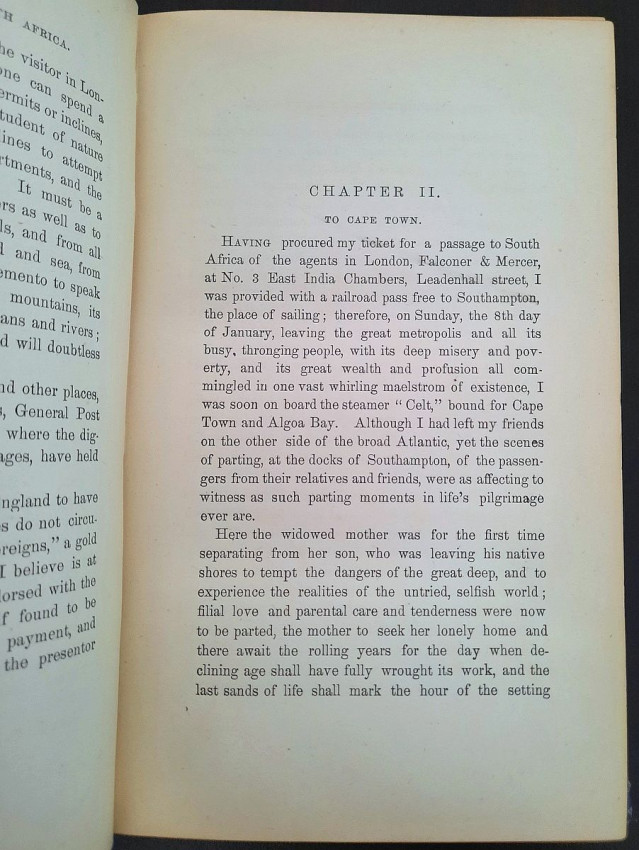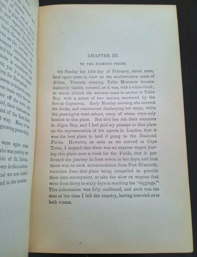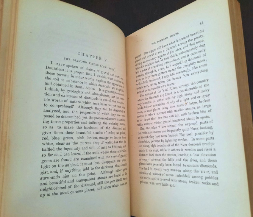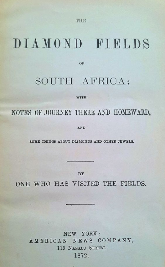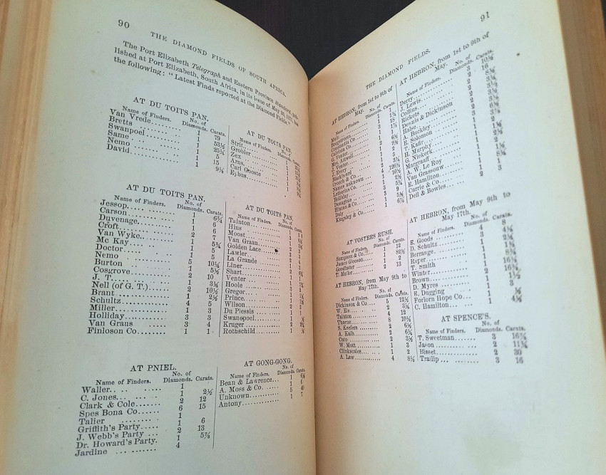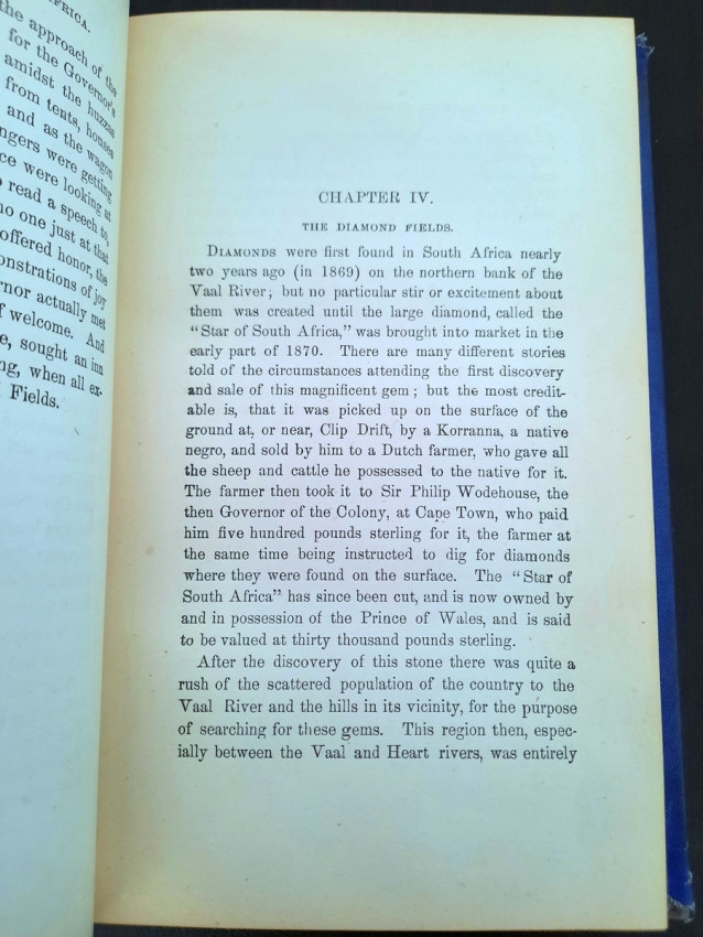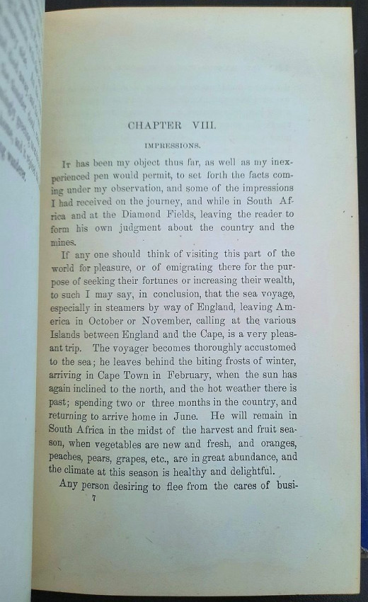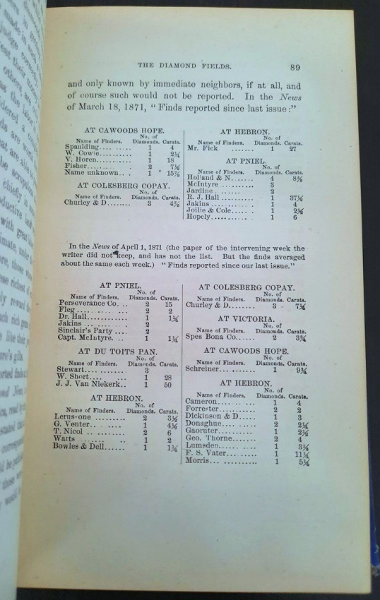 "The journey was made soon after the discovery of the alluvial diggings and the dry mines, and mention is made of "Colesberg Copay (koppie)", "Clip Drift", "Kuskamana", "Sivenelle", and other localities. The account is very interesting, and affords a good description of the exciting days of the early mining camps. The writer left the fields in 1871, at which period he estimated that 5000 labourers were employed by the mines." (Mendelssohn, Vol. I, pages 466-467)