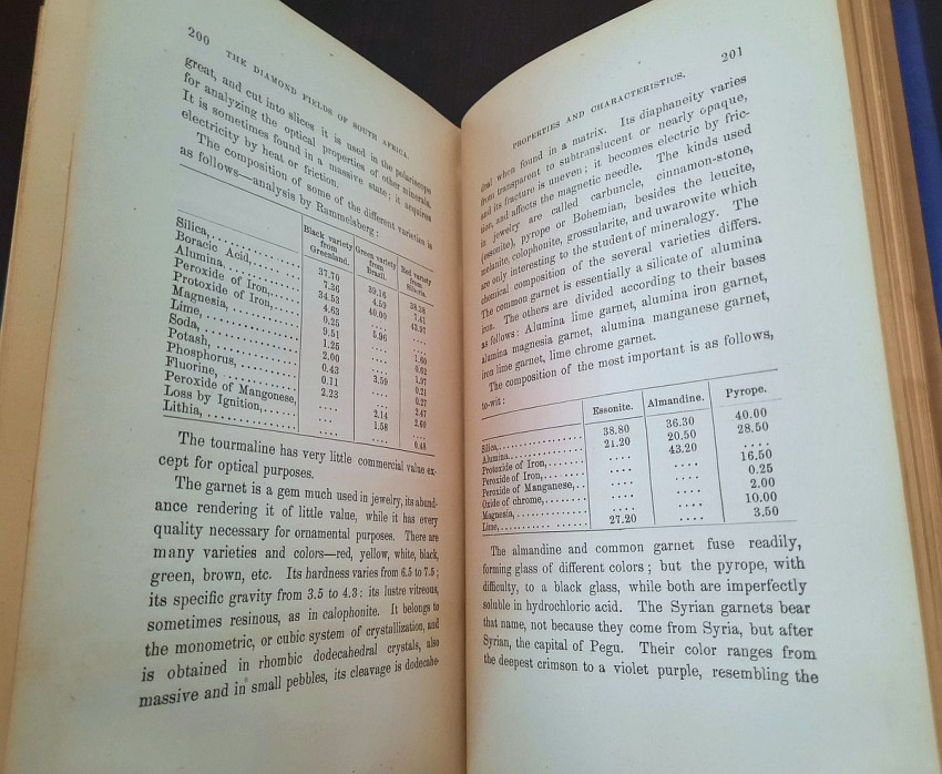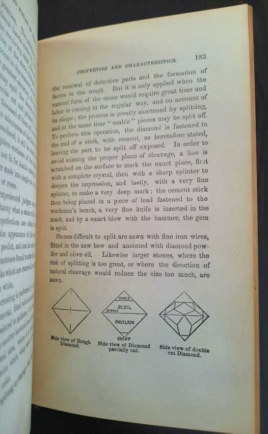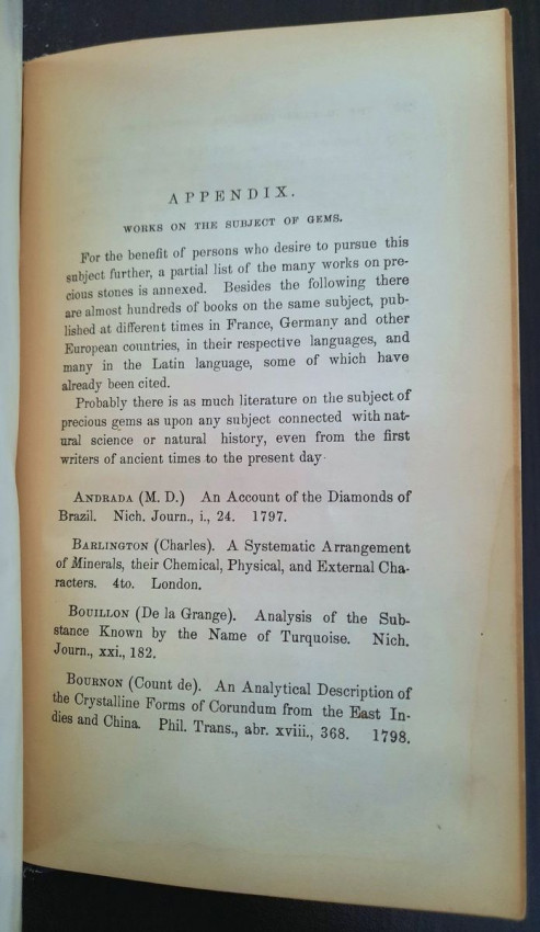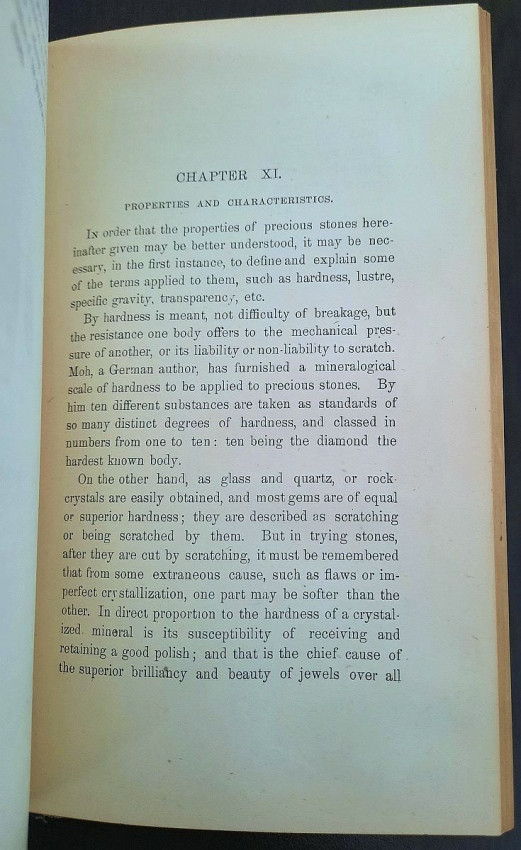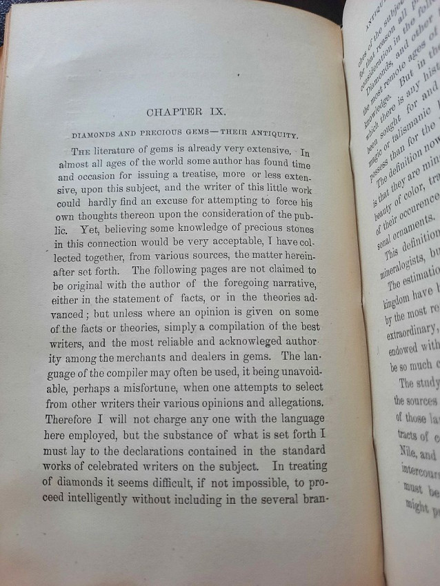 Publisher's dark blue cloth binding with gilt tiles on spine; Text in English; Collation complete - Title page, vi, [7], 238 pages, "Appendix: Works on the subject of gems": p. [231]-238; Binding is tight and firm, worn as usual for the age. Binding little rubbed, extremities bumped, corners crushed, little pieces of cloth missing to the extremities. Othervise hinges and joints are whole and secure, no crackings. Name written by pencil on second free endpaper "Tenie Dunning / Wichita Kansas". The lower left corner of the title page separated from the text block (by 3 cm) and curled up, but present. It appears the bottom and fore-edge were lightly exposed to moisture near the time the book was new. Some light tidemarks to bottom and fore edge as if the book saw dampness near its published date. Up to page 14 is very minor tidemarks. Some barely visible after that, middle (most of the text block) appears clear, then towards the back are some very light ones. Otherwise pages clean and free of writing, no foxing, marks or annotations, only a slight yellowing, well preserved for the age. Overall a sound copy of this scarce item.