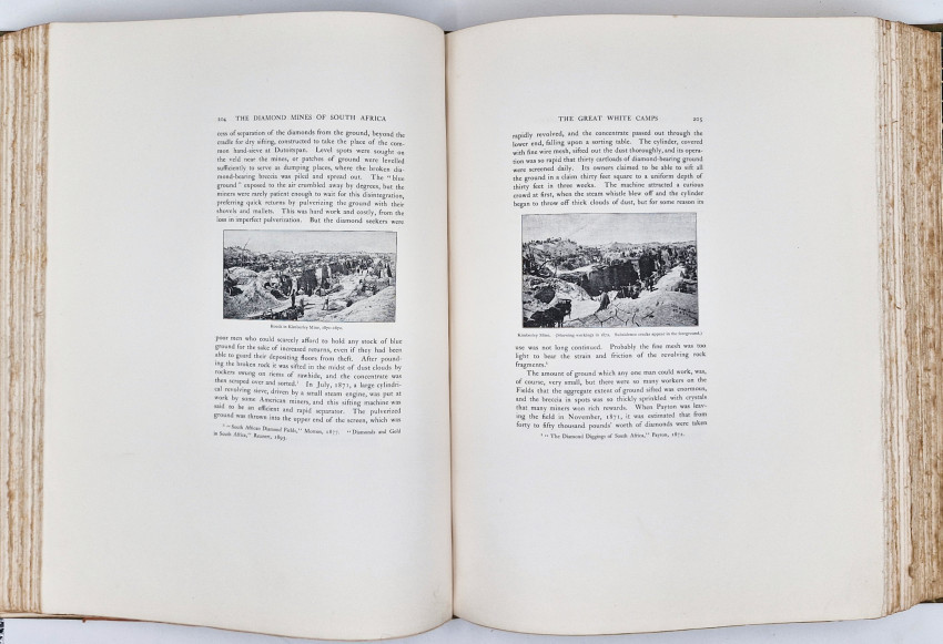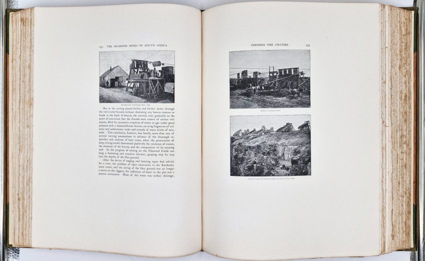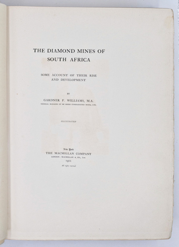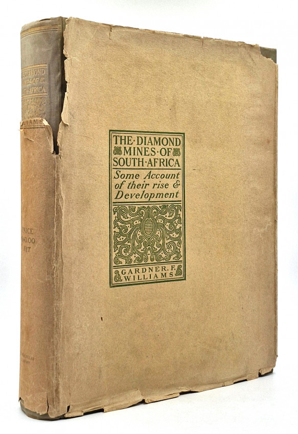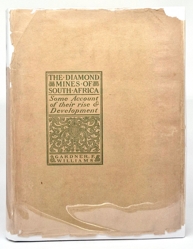 Mendelssohn (Sidney) South African Bibliography volume 2, page 614, 'The author of this historical and practical account of the diamond industry, and especially of the South African diamond mines, was for many years the general manager of the De Beers Consolidated Mines, a gigantic undertaking founded by the late Cecil John Rhodes. The volume contains a full description of the mines with the fullest details respecting their working. Mr. Gardner Williams initiated the present system of work pursued in all underground diamond mines, and the work is replete with valuable information, and is the standard authority on all matters connected with diamonds and diamond-mining. In addition to this, the work contains an account of the celebrated diamonds discovered in bygone times, a description of the discovery of the Kimberley group of mines and the rise of the surrounding townships, chapters on the formation of the diamond, the methods of cutting and polishing the jewels, a description of the early and modern diamond-mining machinery, and an Appendix containing an account of Kimberley during the South African War. The volume is elaborately illustrated, and many of the engravings reproduce ancient maps and charts and photographs of the greatest interest and rarity in connection with the diamond fields.’