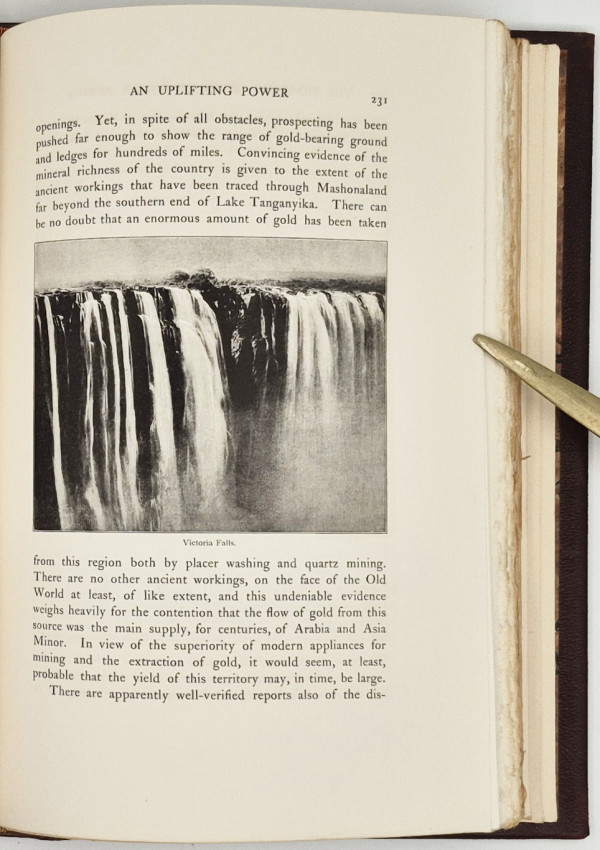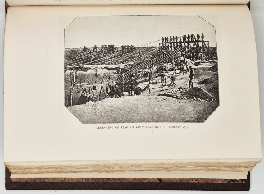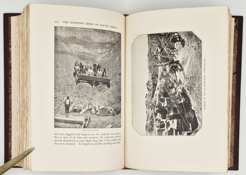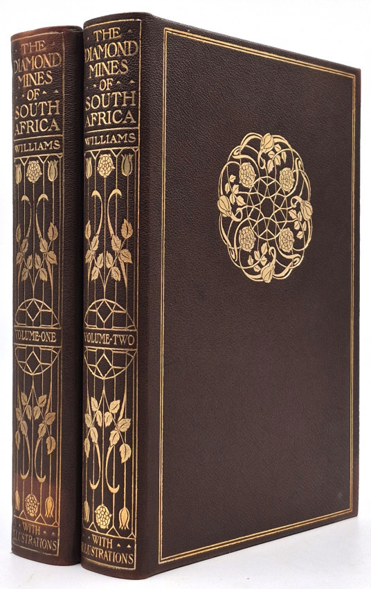 New edition: 2 volumes, 359 + 353 pages, photogravure frontispiece portrait of Williams in volume I and colour frontispiece of diamonds in volume 2, 15 maps - 4 double page, 1 double page coloured plan of Kimberley mine in 1877 and 1 large folding map at the end of volume 2, 26 photogravures and numerous other plates and illustrations some coloured, marbled end papers, uncut fore edge with light foxing, top edge gilt, full brown leather bindings with a gilt vignette on the upper cover and titled gilt with decoration on the spines, in the original glassine paper dust covers, a fine set.