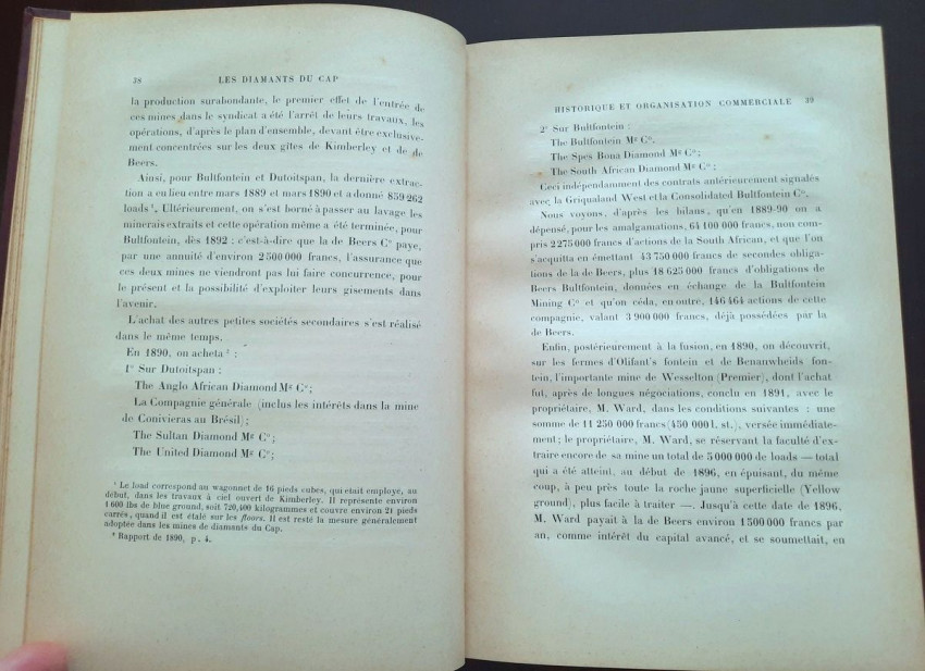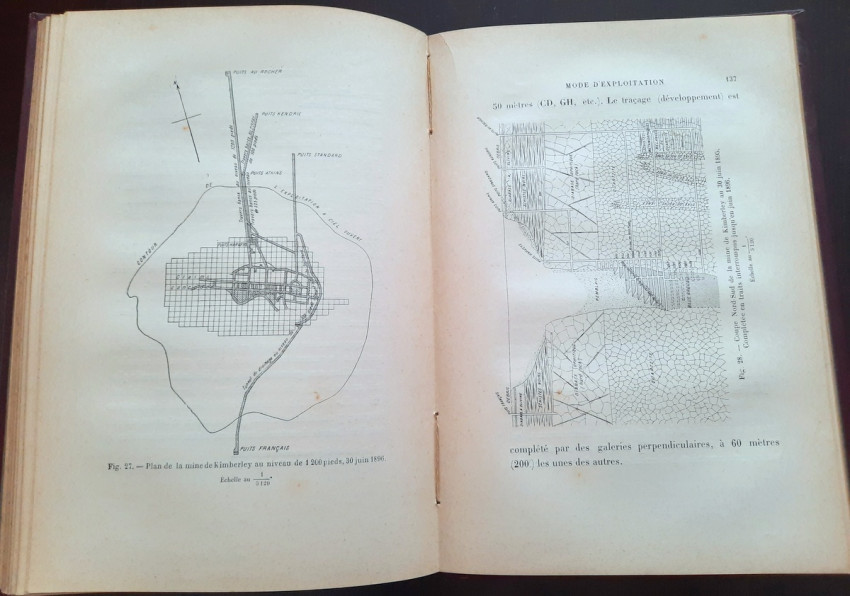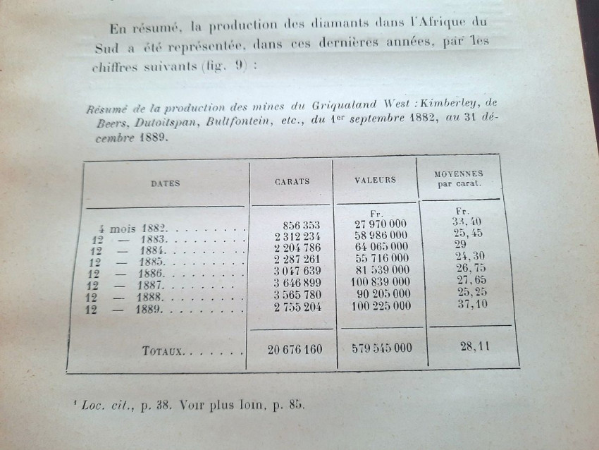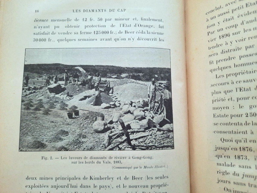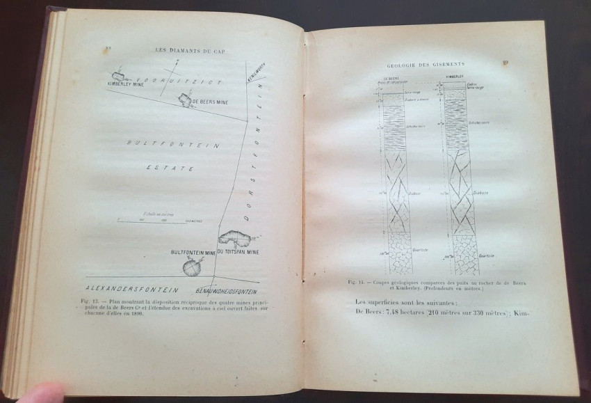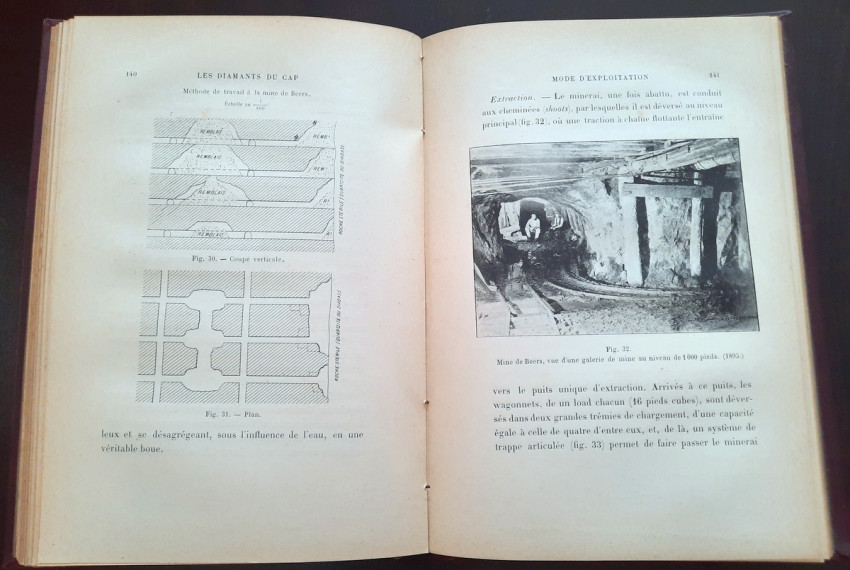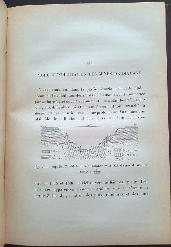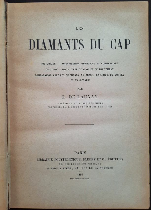 This sought-after book consisted of seven chapters analysing the history and geology of the deposits of Cape, financial and commercial organization of the Cape diamond mining and diamond industry, and giving great importance to the methods of extraction, exploitation, processing and recovery of South African diamonds. The work also includes a general examination of the geological origin of the diamond, its mode of formation in nature and its synthetic reproduction in laboratories. The author, a mining engineer, geologist and speleologist, specialist in mineral deposits and the author of a famous book "The Transvaal Gold Mines" (1896), treats the subject in a very technical and detailed manner.