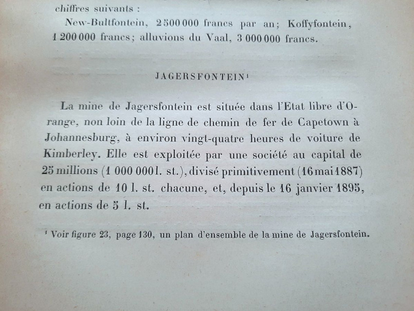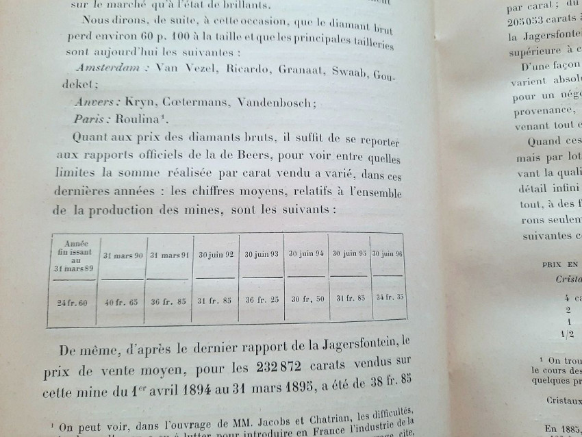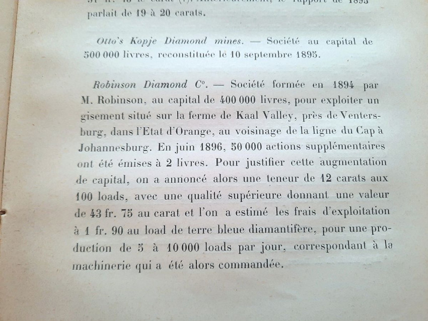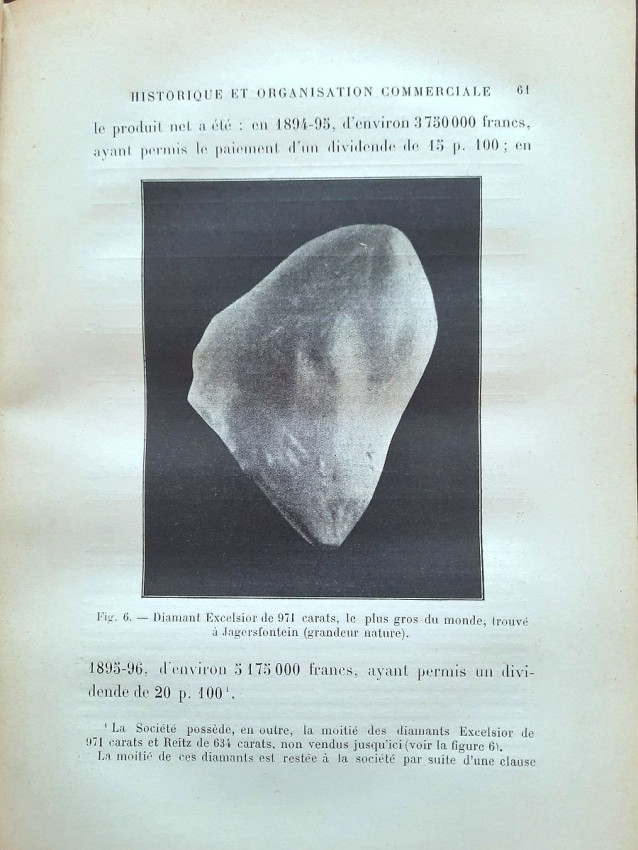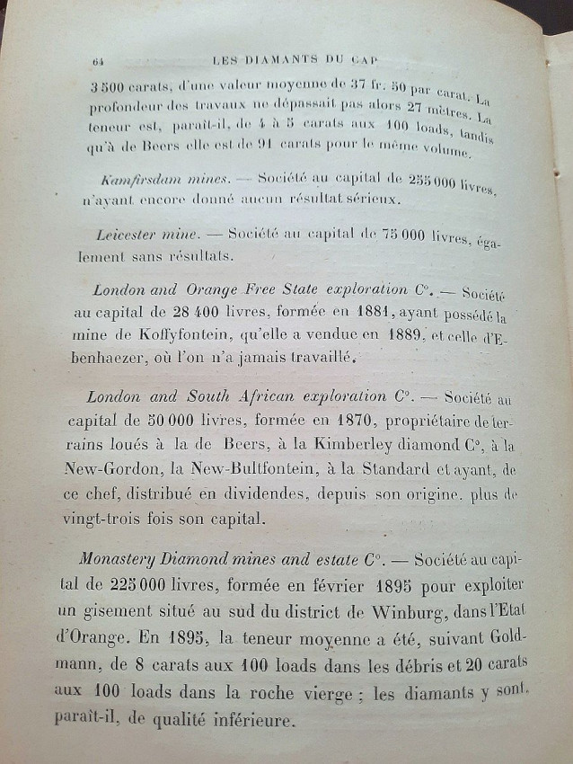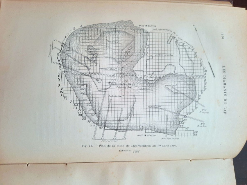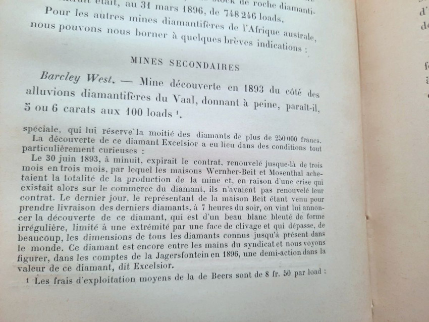 This sought-after book consisted of seven chapters analysing the history and geology of the deposits of Cape, financial and commercial organization of the Cape diamond mining and diamond industry, and giving great importance to the methods of extraction, exploitation, processing and recovery of South African diamonds. The work also includes a general examination of the geological origin of the diamond, its mode of formation in nature and its synthetic reproduction in laboratories. The author, a mining engineer, geologist and speleologist, specialist in mineral deposits and the author of a famous book "The Transvaal Gold Mines" (1896), treats the subject in a very technical and detailed manner.