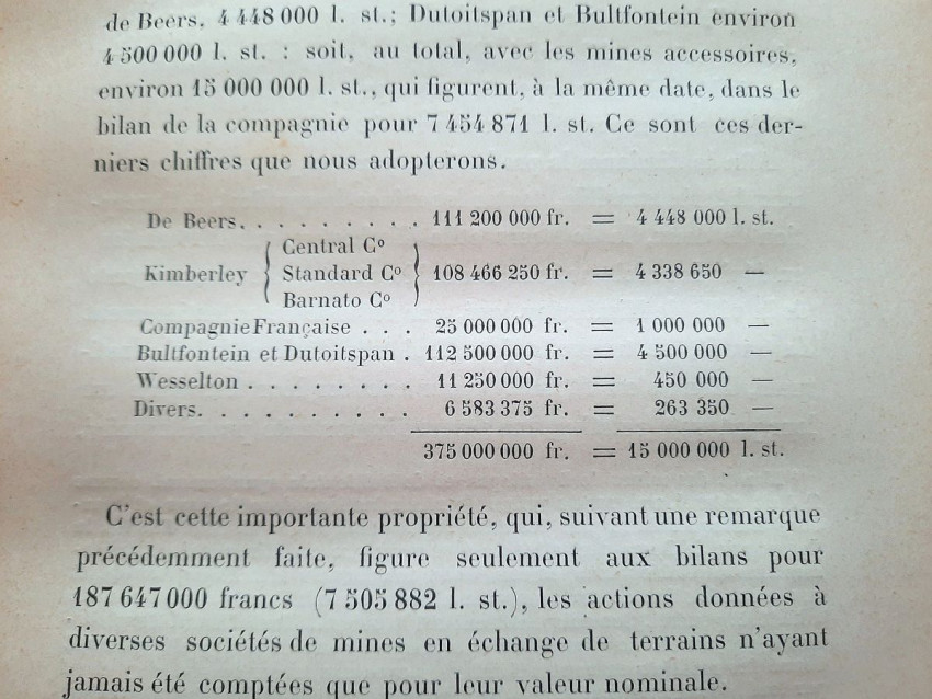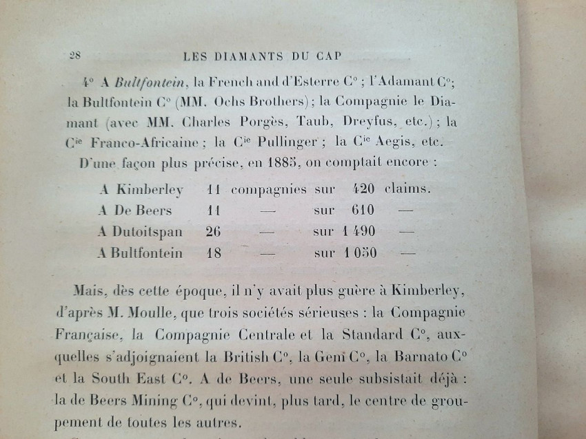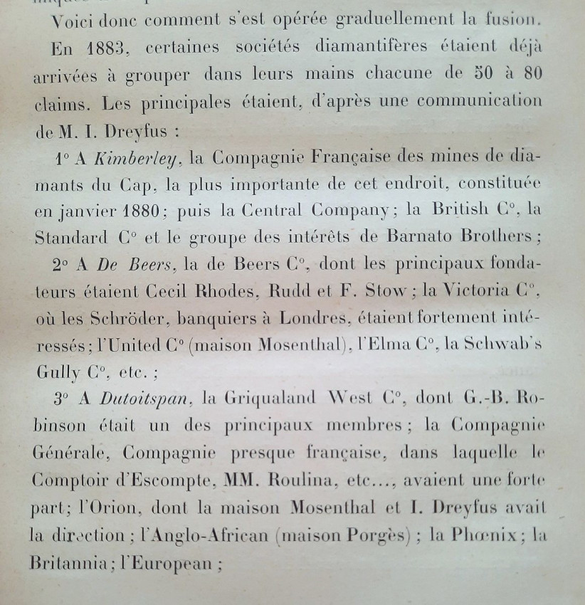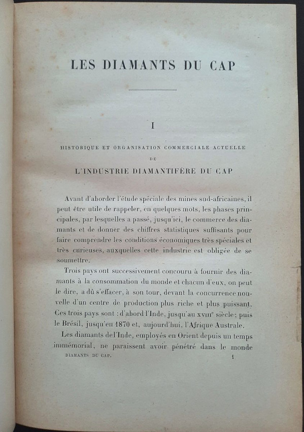 I. HISTORY AND CURRENT COMMERCIAL ORGANIZATION OF THE CAPE DIAMOND INDUSTRY (with sections: The diamond question; Summary of global production; Discovery of diamonds in Cape Town; Strange aspect of the early works; Attempts to merge the various companies; Formation of the de Beers Consolidated Co.; Financial organization of this company; its profits; its reserves; The diamond merchants' syndicate; Price of rough diamonds; The Jagersfontein Co.; Secondary mines of southern Africa);