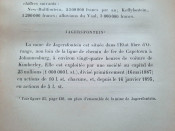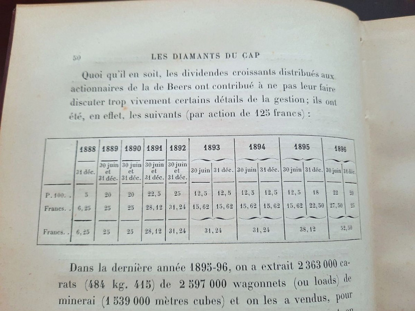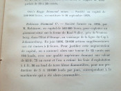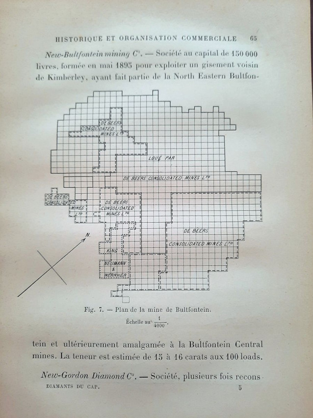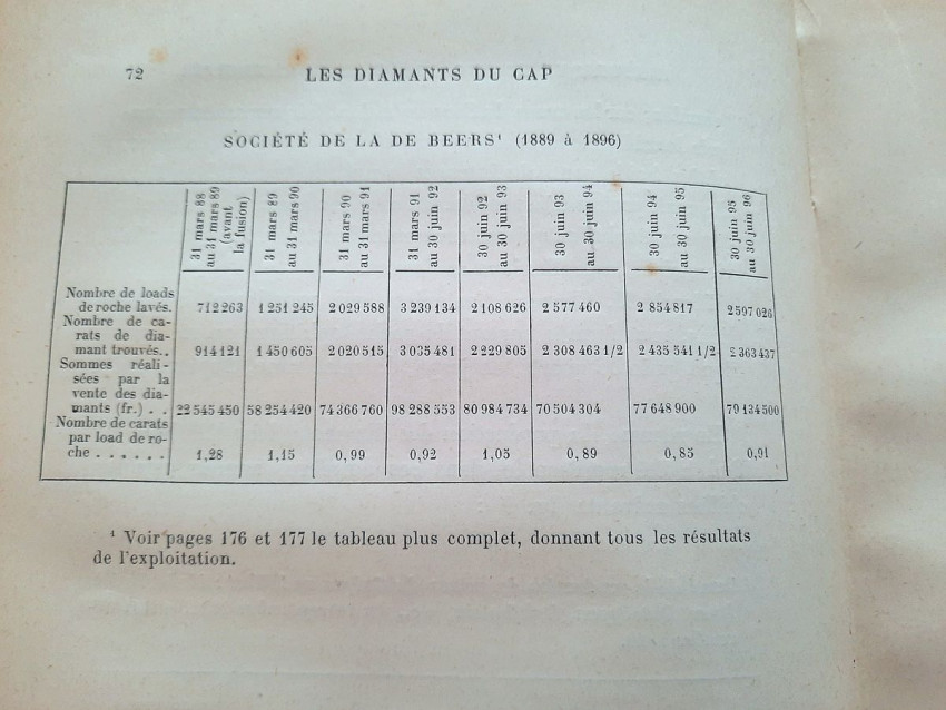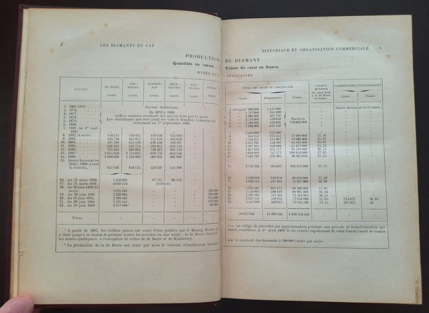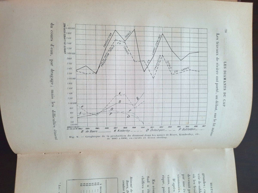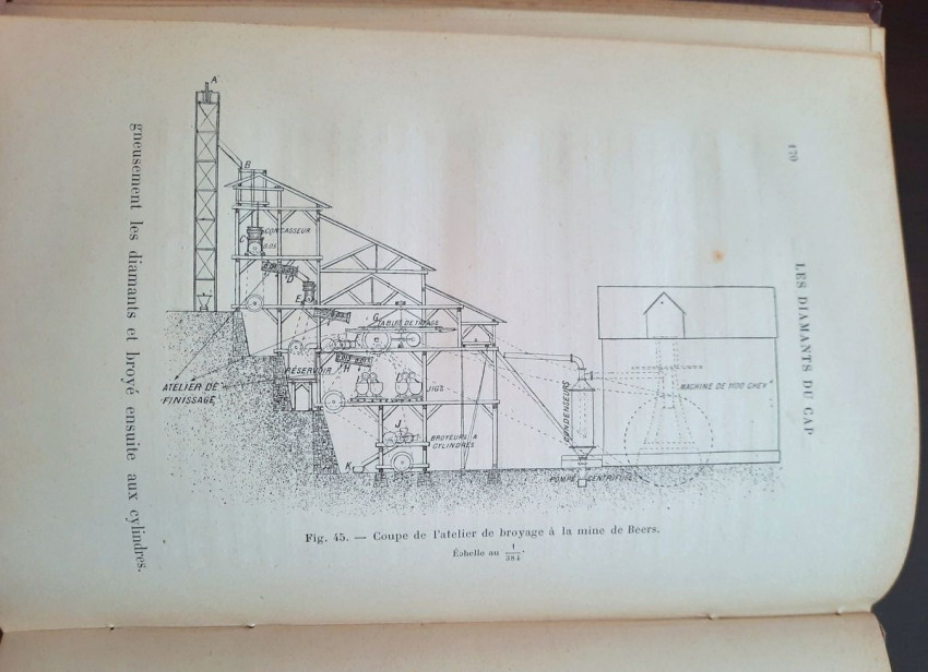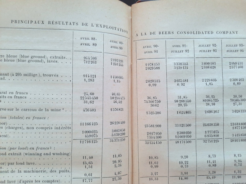 The work is accompanied by numerous in-text photographic illustrations, maps and plans of mines, diagrams and tables, plus three full-page photographic plates and several large sketches of sections of the grinding workshop at the mines. With a multiple folding plate entitled "Compagnie de Beers Cons. - General surface area of mining installations and depot lands". Including a double-page table with statistics of a diamond production in South African mines (by companies) and double-page table with "Main operating results at De Beers Consolidated Company".