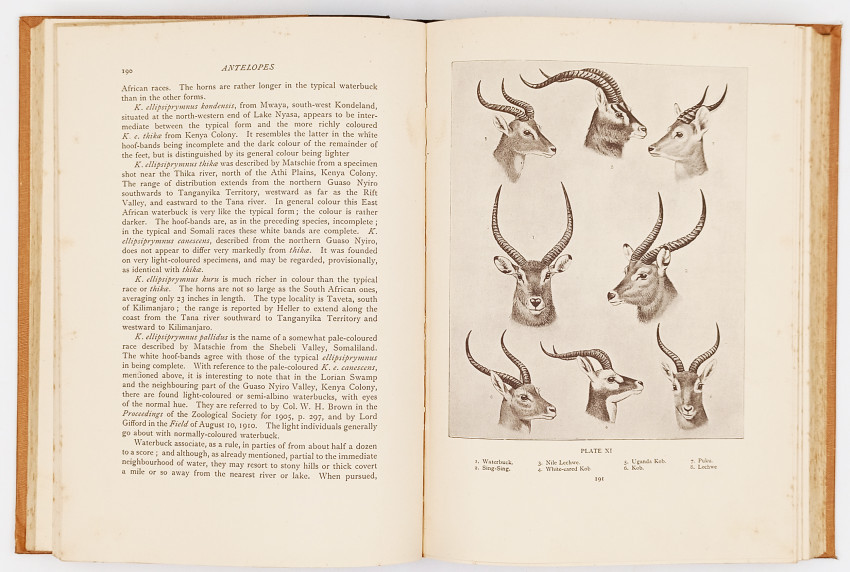 Czech (K.) An Annotated Bibliography of African Big Game Hunting Books 1785 -1999, page 172: An excellent work that covers the natural history of both large and small game animals of Africa. Lydekker utilised segments of text he had written for the Great and Small Game of Africa with much new material added. Especially interesting are the hunting vignettes related by numerous sportsmen such as Selous, Neumann Powell-Cotton and others from books and journal articles.
