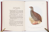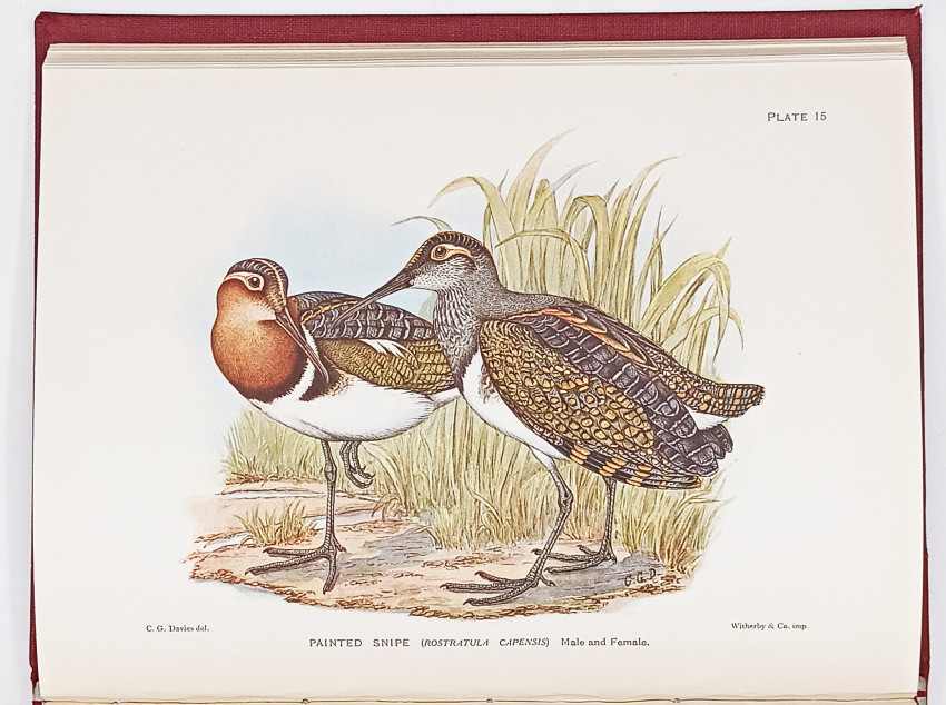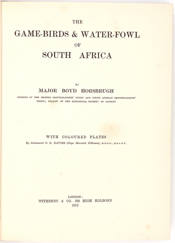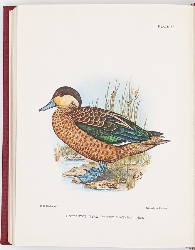 From the preface: 'In this volume I have endeavoured to give descriptions of the Game-Birds and Water-fowl found within South African limits - that is to say, south of a line drawn through the Zambesi River from east to west. With regard to the habits of many species, I am greatly indebted to Serg. C.G. (Finch) Davies, Cape Mounted Riflemen, whose excellent field work has been of the greatest help to me. All notes referring to Pondoland and Griqualand have been communicated to me by him.'
