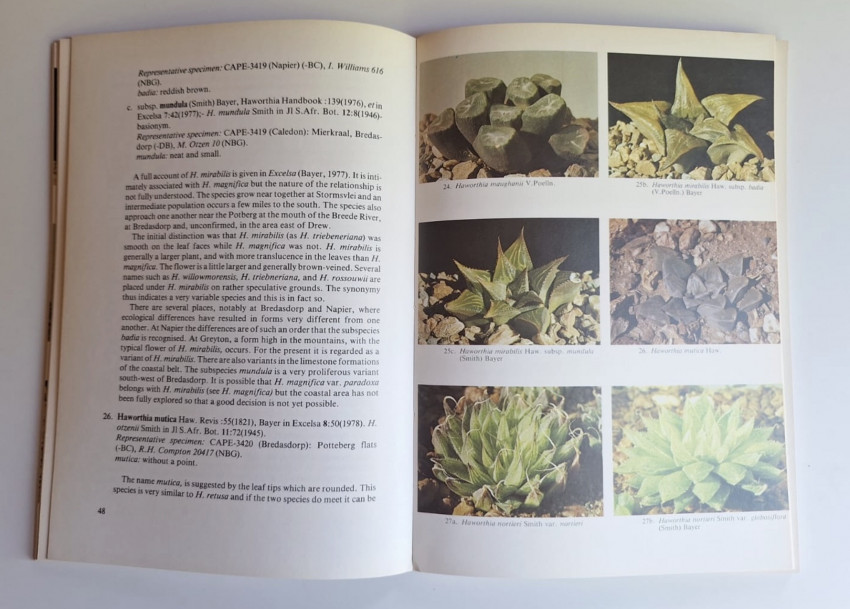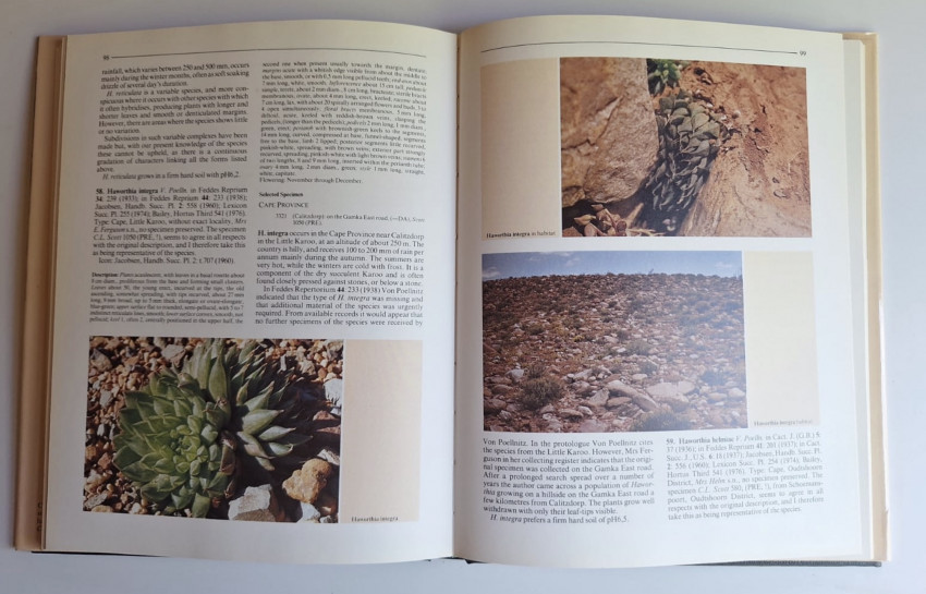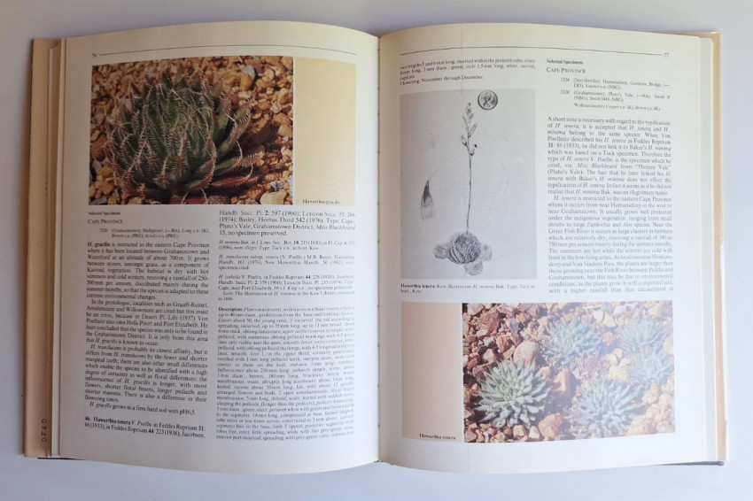 'The genus Haworthia, of the family Liliaceae, has captured the imagination of botanists, horticulturists and collectors worldwide, and has become the favoured subject of many succulent plant collections. All the fascination of these delightful aloe-like succulents is in their varied growth forms. They are generally easy to propagate from leaves and many are very prolific, forming clumps of offsets which, in turn, can form their own clumps. Endemic to the southernmost parts of the African continent, the great majority of the species are found in the Cape Province of the Republic of South Africa, with only a few species occurring outside of that Province.