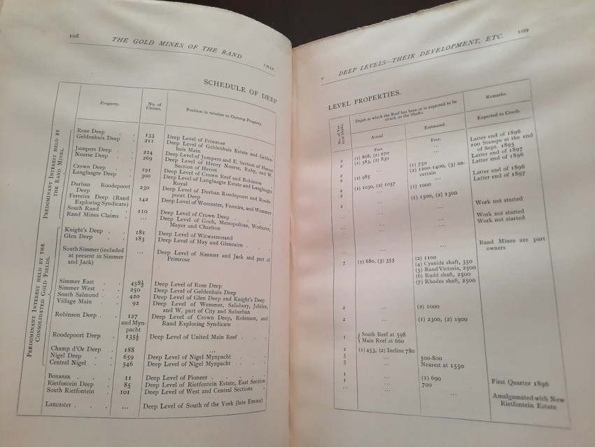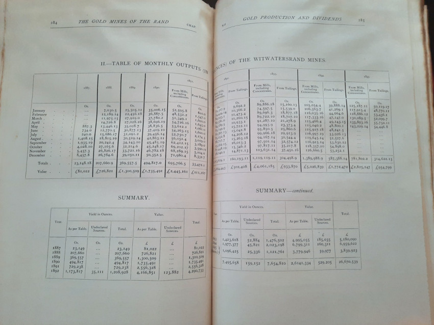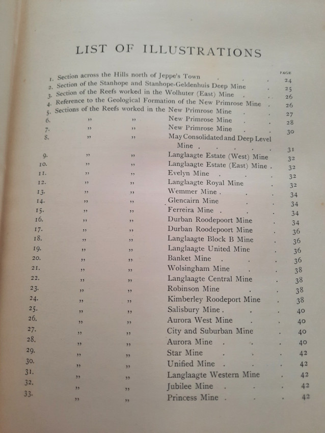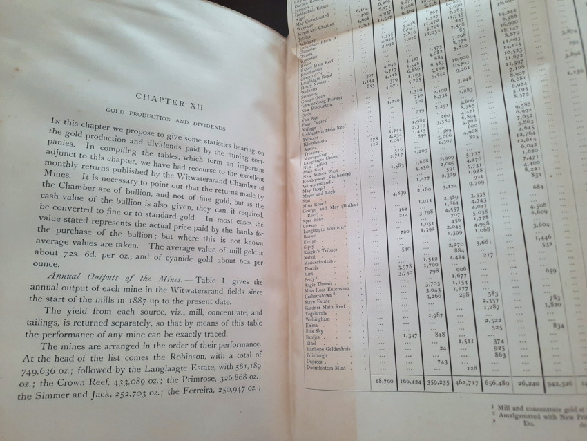 With 5 colored multiple folding plans & sections, 14 photo plates, folding table with "Annual output of the mines in the Witwatersrand Goldfields from 1887 to June, 1895", "Table of monthly outputs of the Witwatersrand mines from 1887 to June, 1895", folding table with "Summary of dividends paid by Witwatersrand gold mining companies from 1887 to June, 1895", table with "Schedule of Mining Companies showing Capitalisation and Market Valuation at 19th June, 1895. Johannesburg quotations". Including the chapters "Gold law and mining regulations" and "Gold production and dividends". Also contains 80 in-text figures, and many other tables, statistics, calculations, etc.