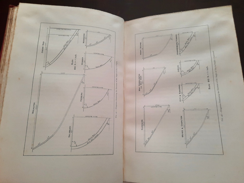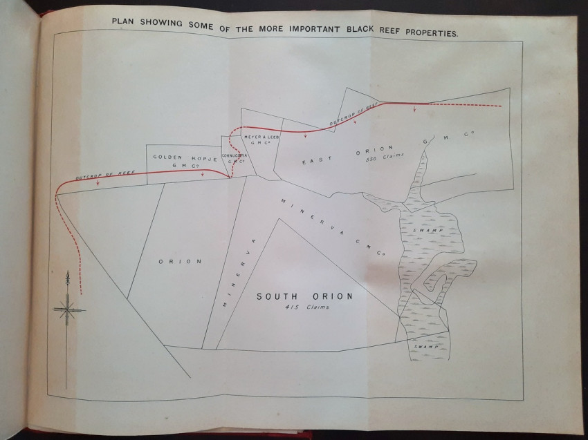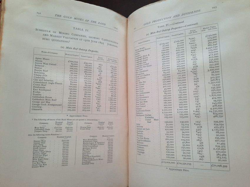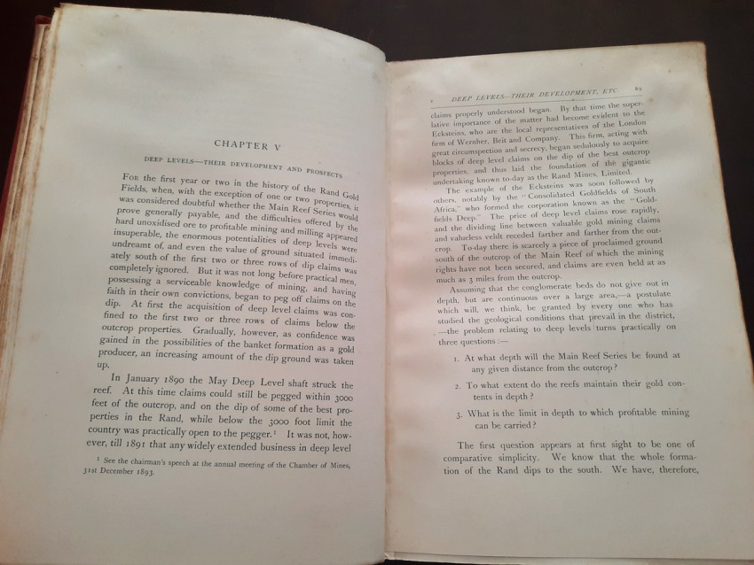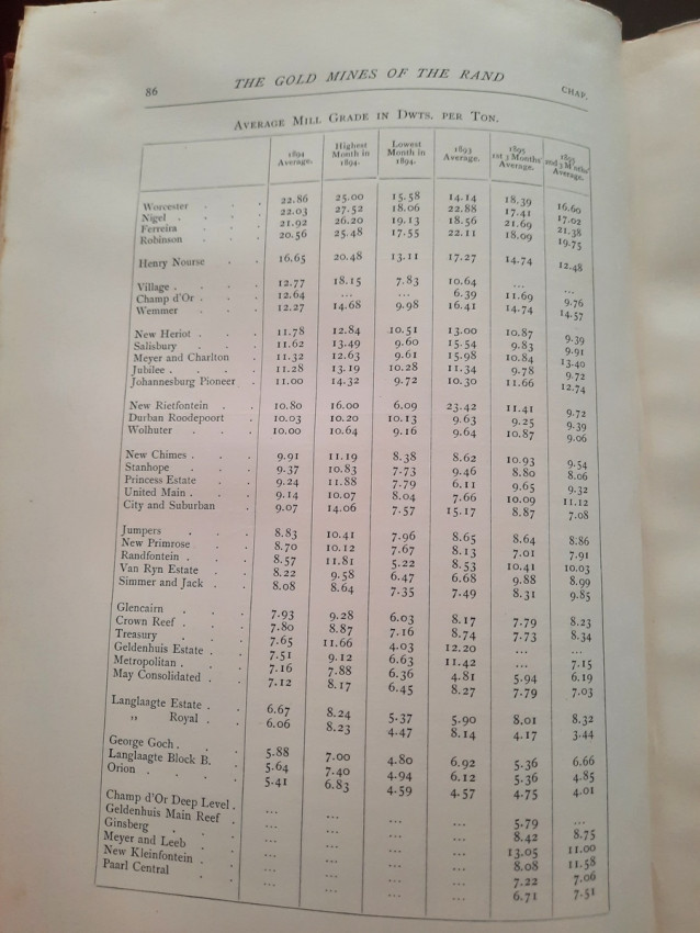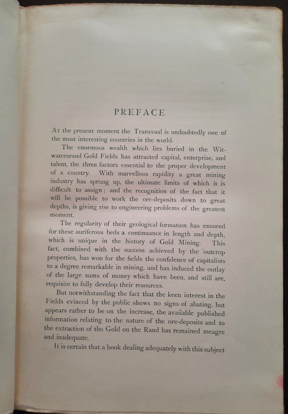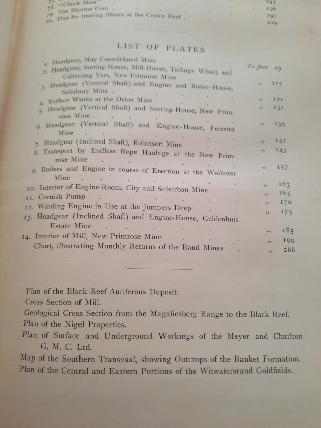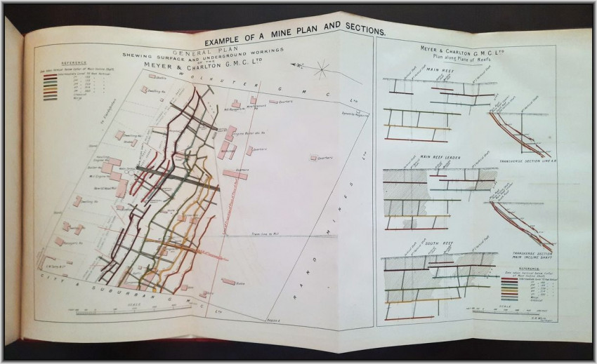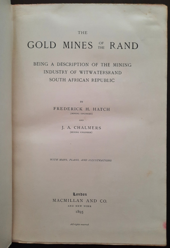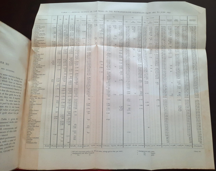 With 5 colored multiple folding plans & sections, 14 photo plates, folding table with "Annual output of the mines in the Witwatersrand Goldfields from 1887 to June, 1895", "Table of monthly outputs of the Witwatersrand mines from 1887 to June, 1895", folding table with "Summary of dividends paid by Witwatersrand gold mining companies from 1887 to June, 1895", table with "Schedule of Mining Companies showing Capitalisation and Market Valuation at 19th June, 1895. Johannesburg quotations". Including the chapters "Gold law and mining regulations" and "Gold production and dividends". Also contains 80 in-text figures, and many other tables, statistics, calculations, etc.