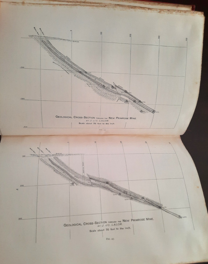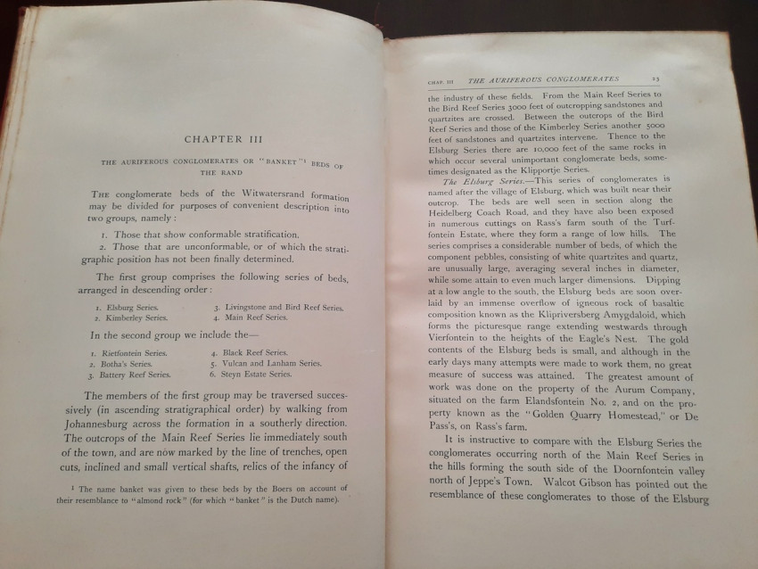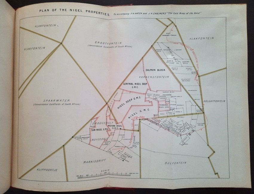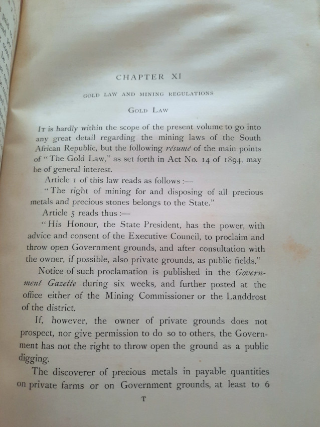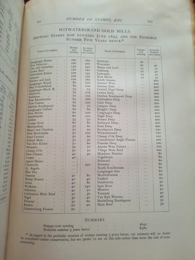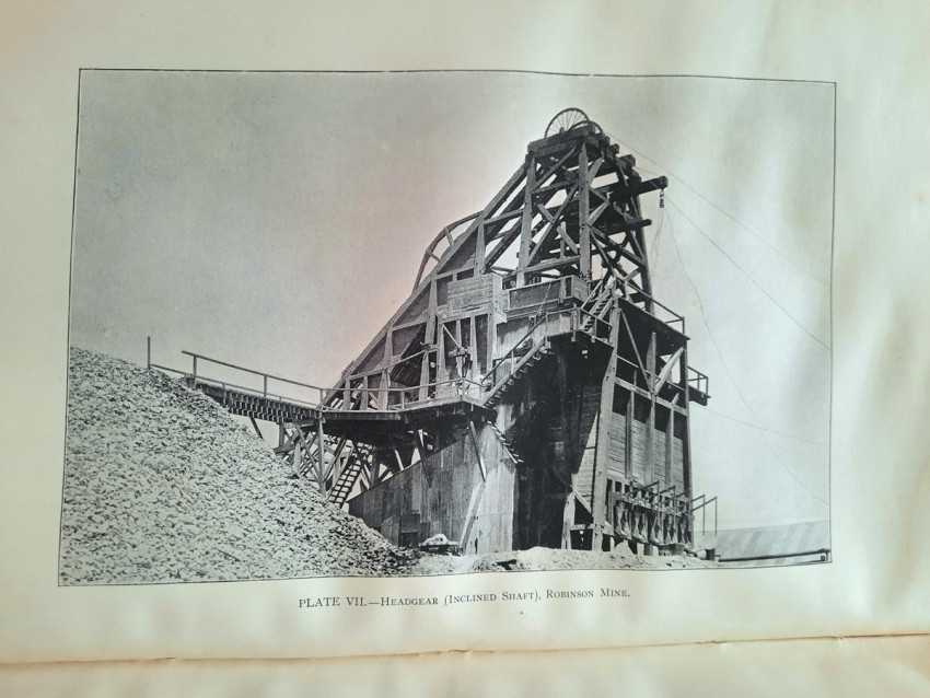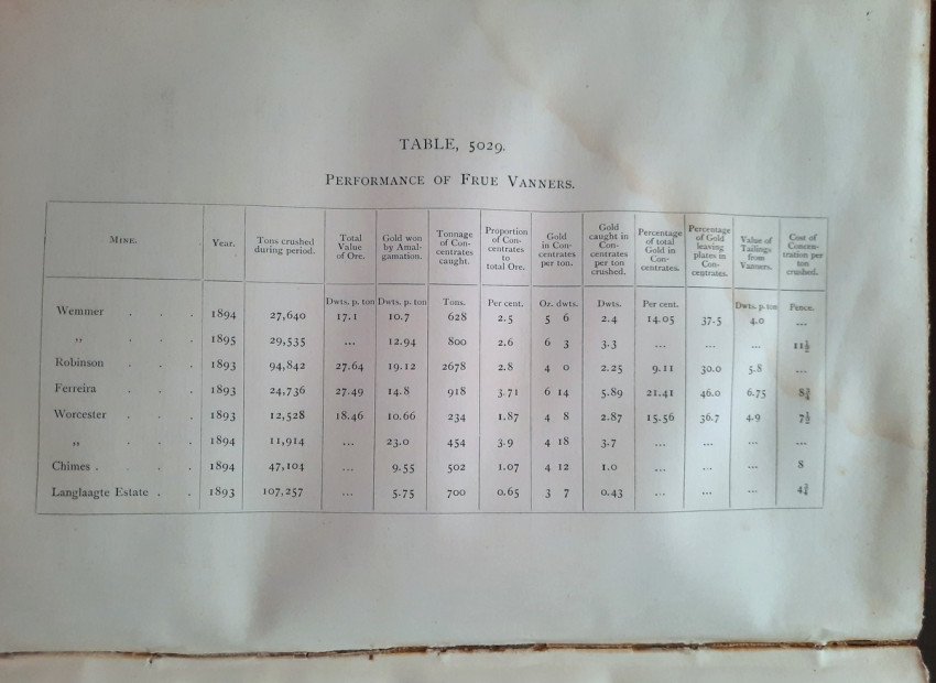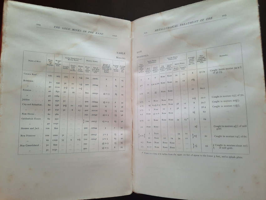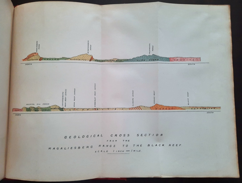 With 5 colored multiple folding plans & sections, 14 photo plates, folding table with "Annual output of the mines in the Witwatersrand Goldfields from 1887 to June, 1895", "Table of monthly outputs of the Witwatersrand mines from 1887 to June, 1895", folding table with "Summary of dividends paid by Witwatersrand gold mining companies from 1887 to June, 1895", table with "Schedule of Mining Companies showing Capitalisation and Market Valuation at 19th June, 1895. Johannesburg quotations". Including the chapters "Gold law and mining regulations" and "Gold production and dividends". Also contains 80 in-text figures, and many other tables, statistics, calculations, etc.