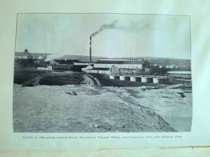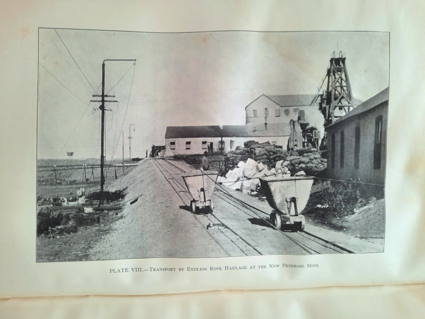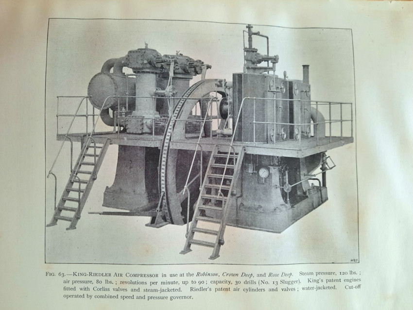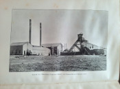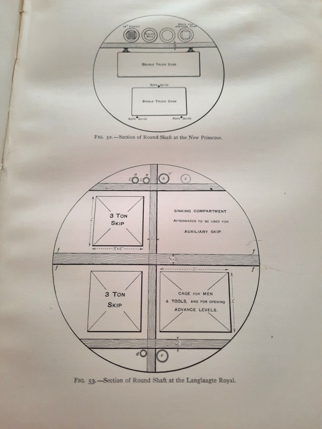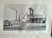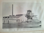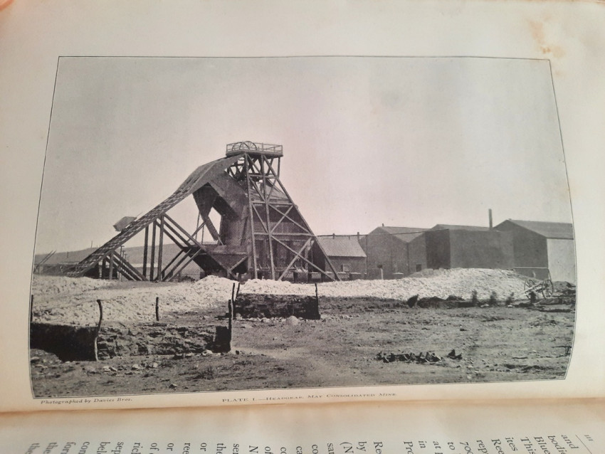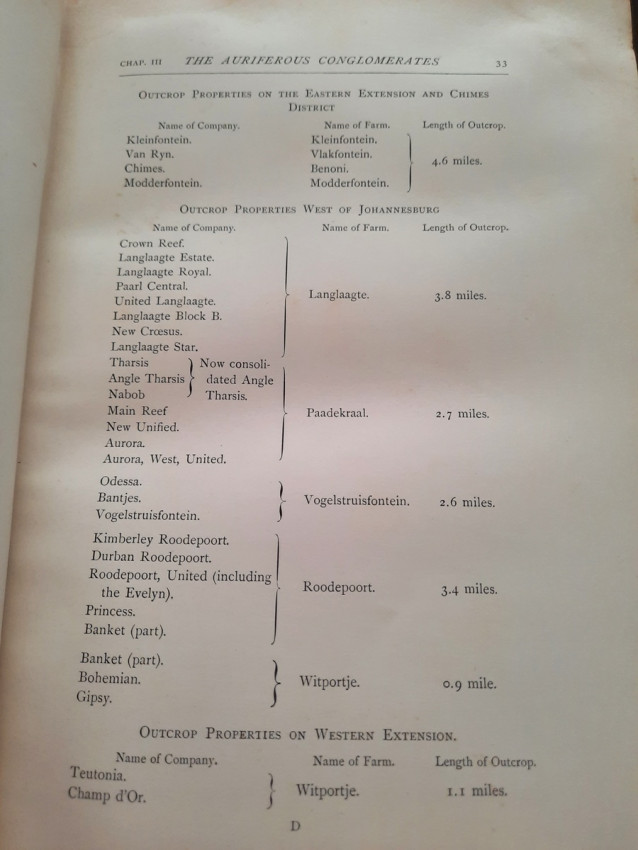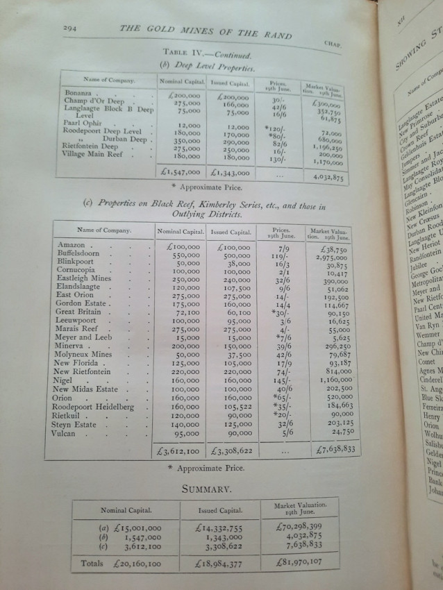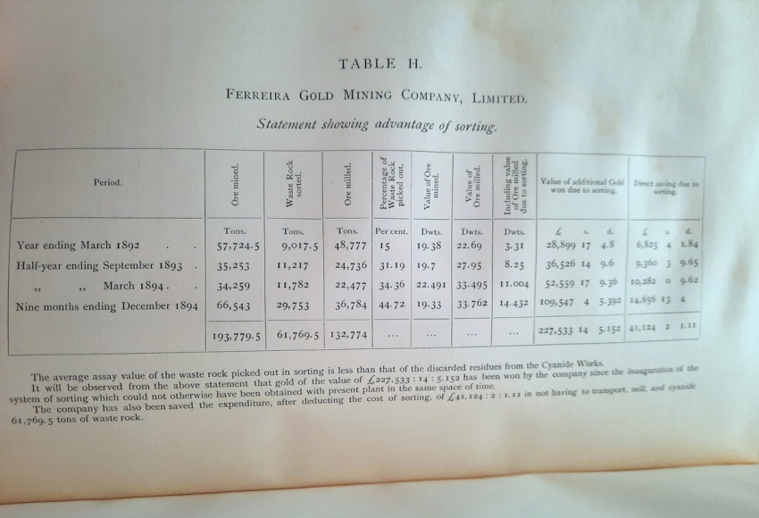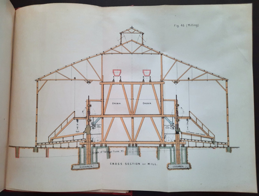 With 5 colored multiple folding plans & sections, 14 photo plates, folding table with "Annual output of the mines in the Witwatersrand Goldfields from 1887 to June, 1895", "Table of monthly outputs of the Witwatersrand mines from 1887 to June, 1895", folding table with "Summary of dividends paid by Witwatersrand gold mining companies from 1887 to June, 1895", table with "Schedule of Mining Companies showing Capitalisation and Market Valuation at 19th June, 1895. Johannesburg quotations". Including the chapters "Gold law and mining regulations" and "Gold production and dividends". Also contains 80 in-text figures, and many other tables, statistics, calculations, etc.
