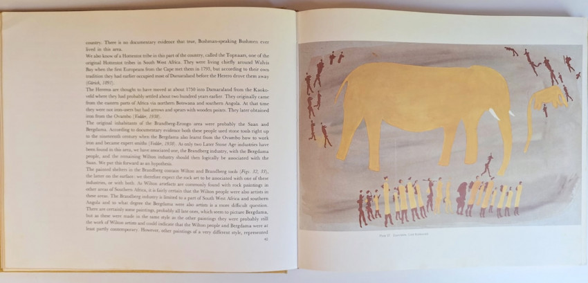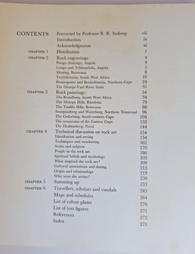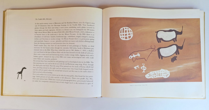 The book surveys San rock art across southern Africa, from Angola to the Cape, organized by geographic regions and stylistic zones like the Drakensberg, arid interior, and coastal areas. Paintings and engravings depict animals, hunters, hybrid beings, and abstracts, presented as tied to hunting, trance rituals, and hunter‐artist spirituality.