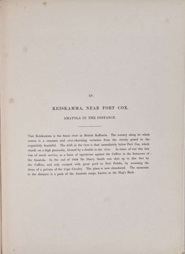 In his preface Thomson writes, 'The artist visited and sketched every one of the localities in this series with no other object than faithfully to portray scenes, not only in themselves beautiful and picturesque, but of personal and historic interest to many families in and beyond the colony. The title of the work was a sufficient guide to the choice of subjects. With the exception of the frontispiece, they are all confined to the Eastern Province of the colony and the British Kaffraria, and are illustrative of the country occupied by the British settlers of 1820, and especially of such scenes as have become famous in colonial history during the successive wars which have been waged against the original possessors of the soil, the indomitable Caffres.'