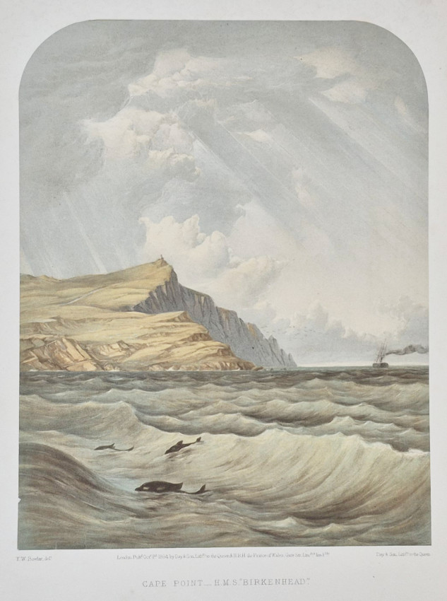 First edition: Unpaginated, triple tinted lithographic frontispiece (Cape Point - H.M.S. Birkenhead), 19 fine hand coloured double tinted lithographic plates heightened with gum arabic on blued India paper, each plate with accompanying text, original blind stamped green pebble-grained cloth, titled gilt on upper cover, all edges gilt, all the India paper proof images are in bright condition, a very good copy.