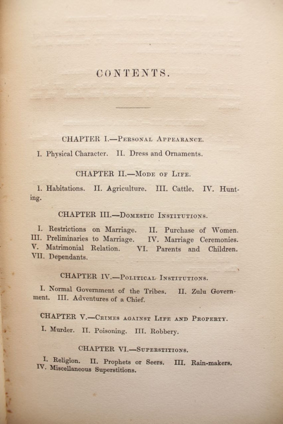 The volume contains a history of Chaka and his successors, together with a complete account of the personal appearance, mode of life, and the political, social, and domestic institutions of the natives, with information respecting their superstitions, laws, warfare, and manufactures. In the appendix will be found " A Sketch of Natal," and a short grammar of the Kaffir language, and there are four lithographic plates, from sketches by Mr. E. Redinger of Natal, and a number of woodcuts in the letterpress.
