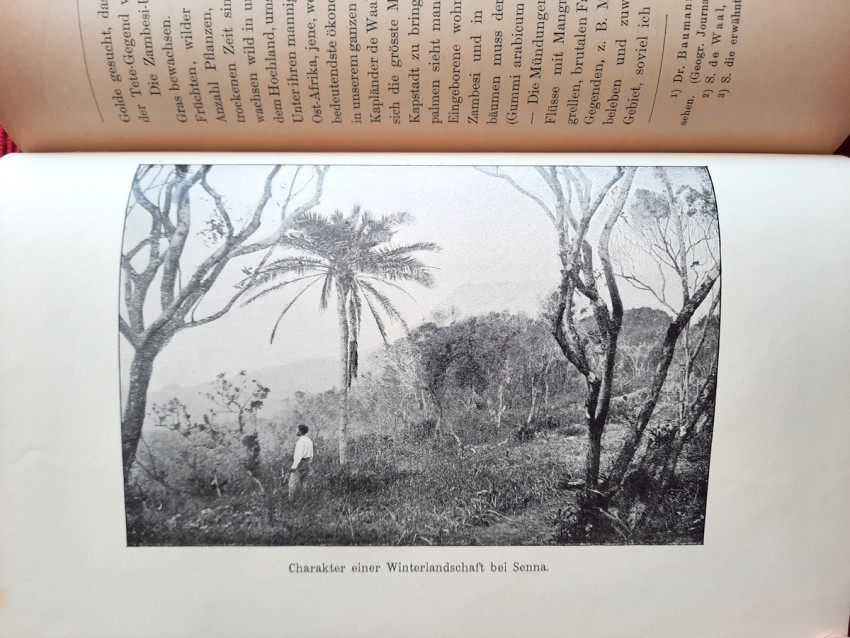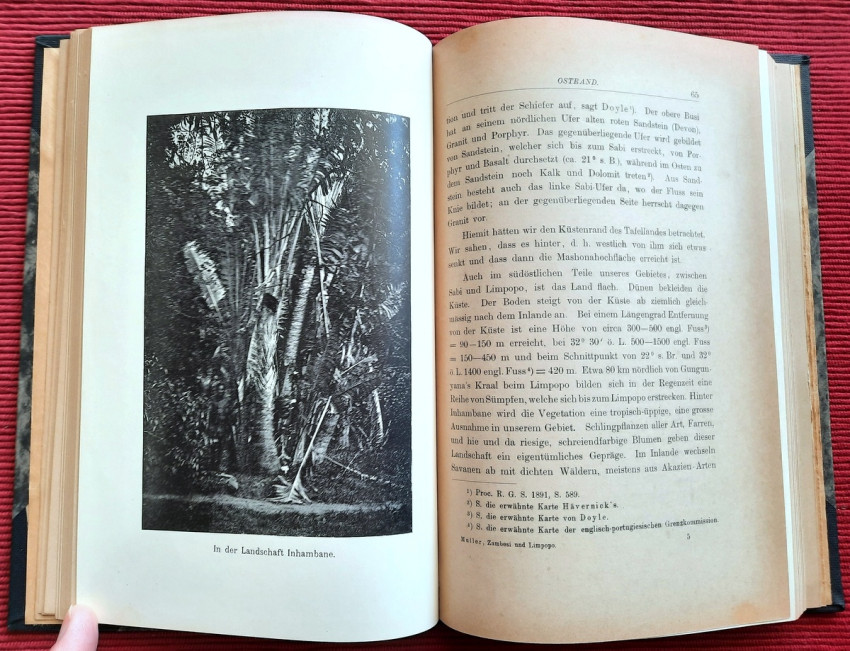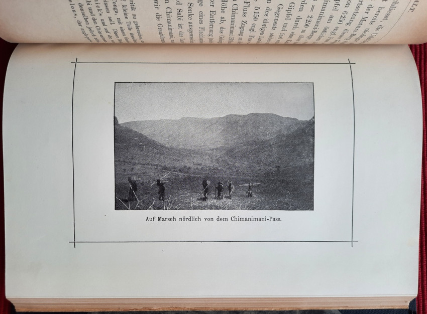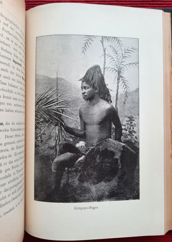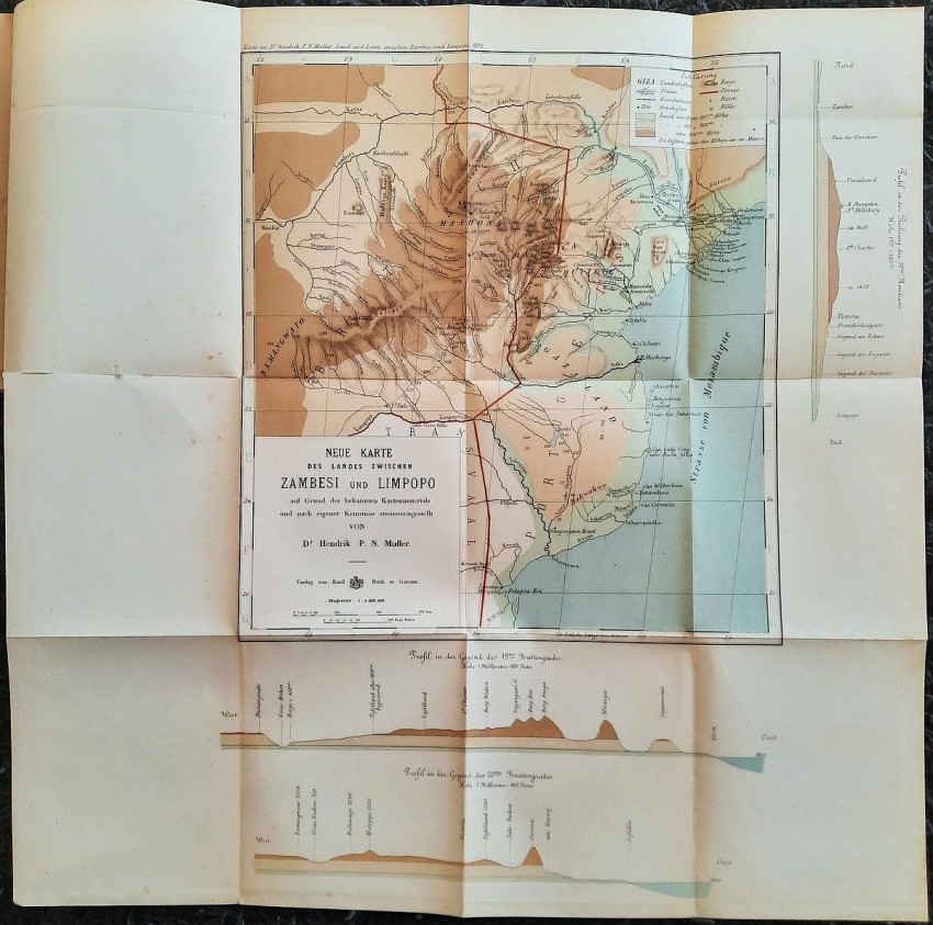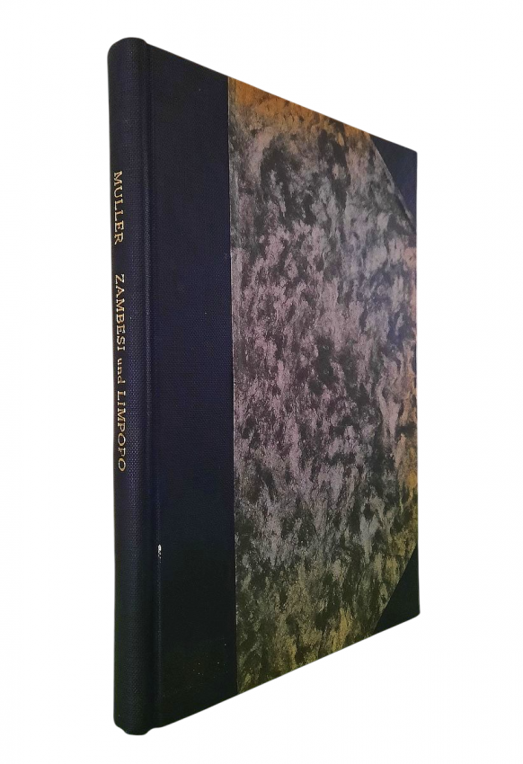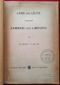 "Land und Leute zwischen Zambesi und Limpopo."; Contemporary ex-library hardcover binding with marble boards and cloth spine and corners, gilt lettering to the spine; Text in German; Collation complete - Title page, 165 pages, with 12 b&w photographic illustrated plates and color folding map at the rear (54 x 54 cm); A well preserved ex-library copy. The only markings are ex-library stamp to the title page and a discard stamp from a closed library. Binding with a negligible shelf wears, overall tight, firm and secure, slight fading of marbled boards, almost invisible trace of an detached ex-library label to the bottom of the spine. Text block clean, but with age tanning (except all 12 plates which are perfectly bright and clean), sporadic light foxing to few pages, otherwise no markings or annotations throughout. Slightly restored attachment to the binding at pages 15 and 162-163. A sound copy of this extremelly rare title.