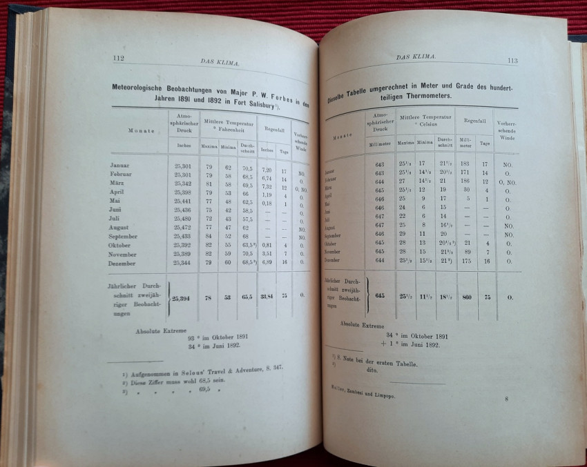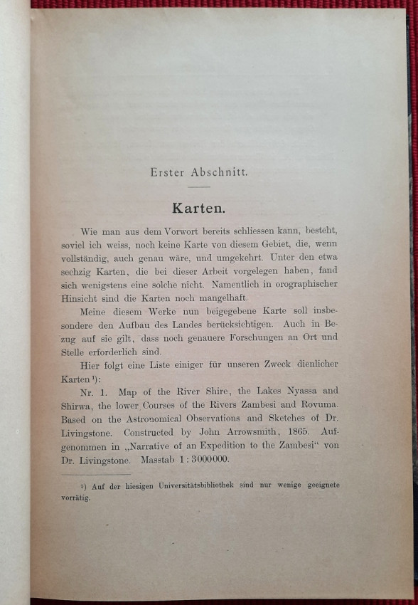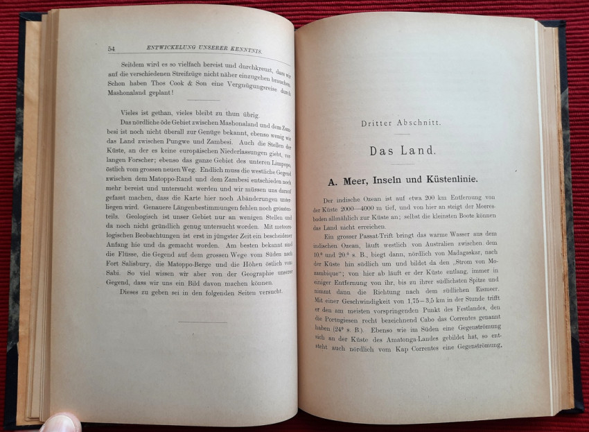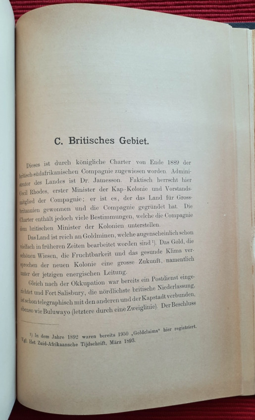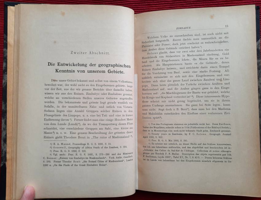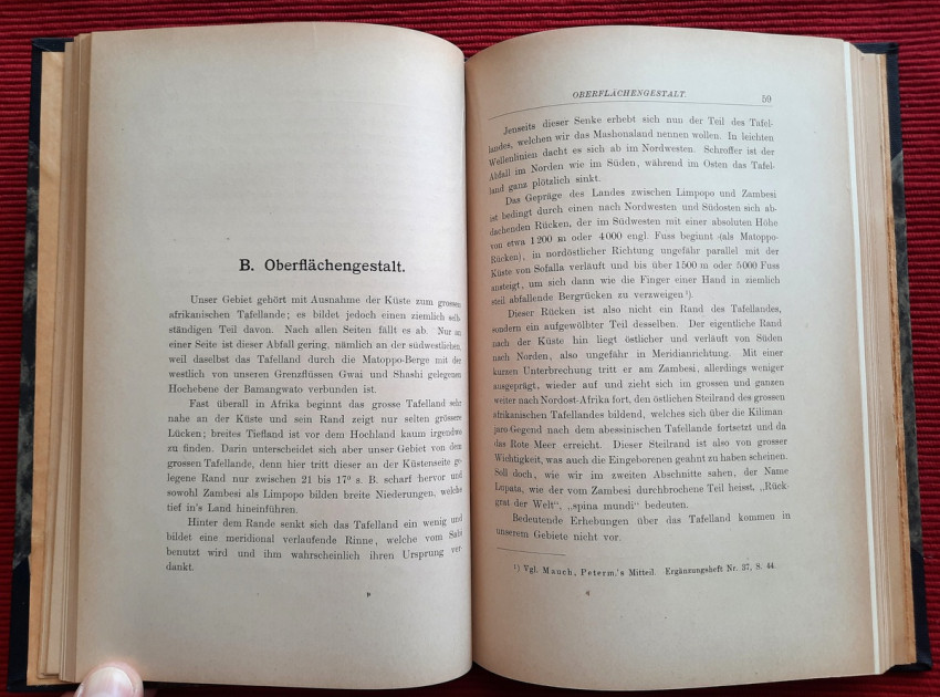 "Land und Leute zwischen Zambesi und Limpopo."; Contemporary ex-library hardcover binding with marble boards and cloth spine and corners, gilt lettering to the spine; Text in German; Collation complete - Title page, 165 pages, with 12 b&w photographic illustrated plates and color folding map at the rear (54 x 54 cm); A well preserved ex-library copy. The only markings are ex-library stamp to the title page and a discard stamp from a closed library. Binding with a negligible shelf wears, overall tight, firm and secure, slight fading of marbled boards, almost invisible trace of an detached ex-library label to the bottom of the spine. Text block clean, but with age tanning (except all 12 plates which are perfectly bright and clean), sporadic light foxing to few pages, otherwise no markings or annotations throughout. Slightly restored attachment to the binding at pages 15 and 162-163. A sound copy of this extremelly rare title.
