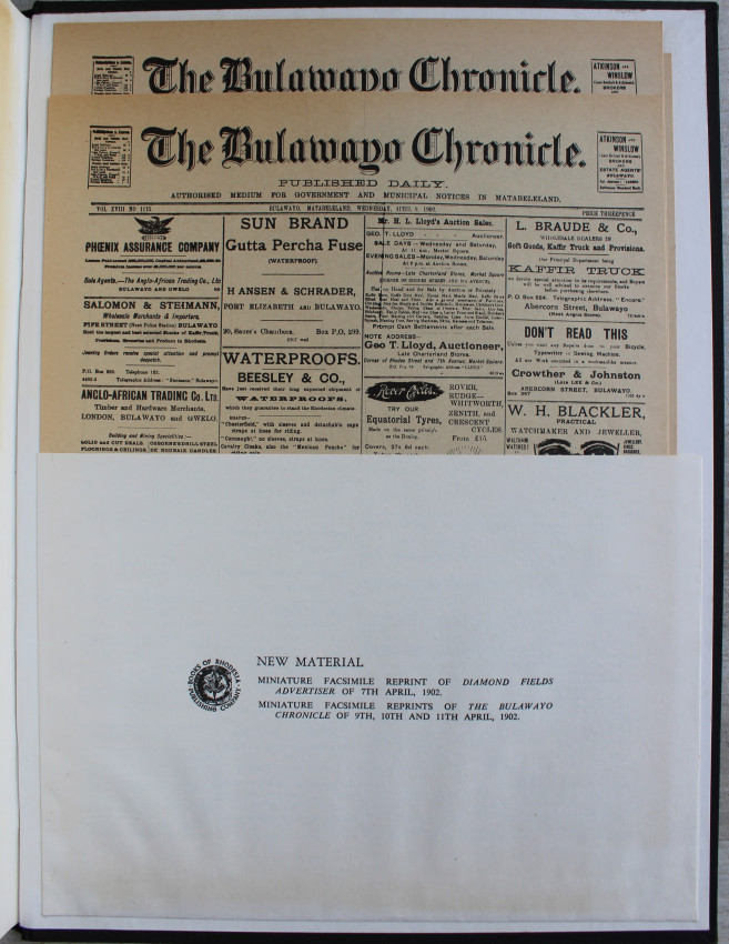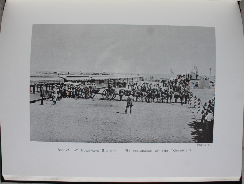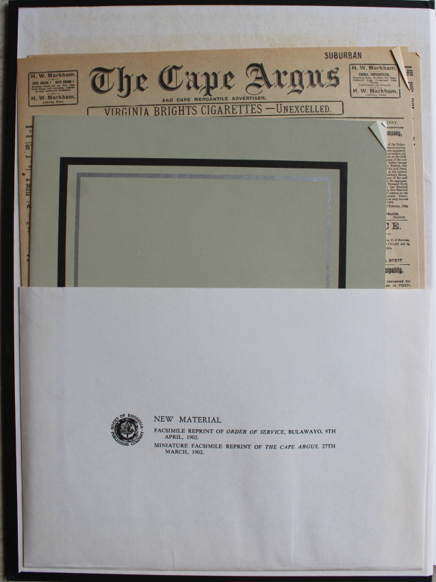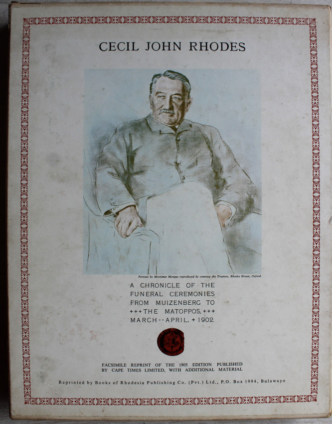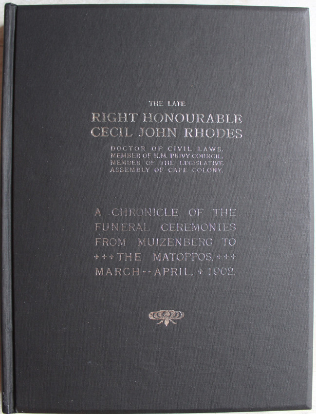 Seventy-eight pages of letterpress text with accounts of the funeral ceremonies from the columns of The Cape Times, Diamond Fields Advertiser, and The Bulawayo Chronicle, followed by forty-six full-page photogravures.