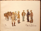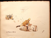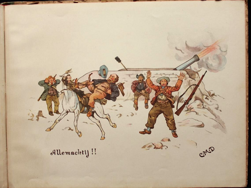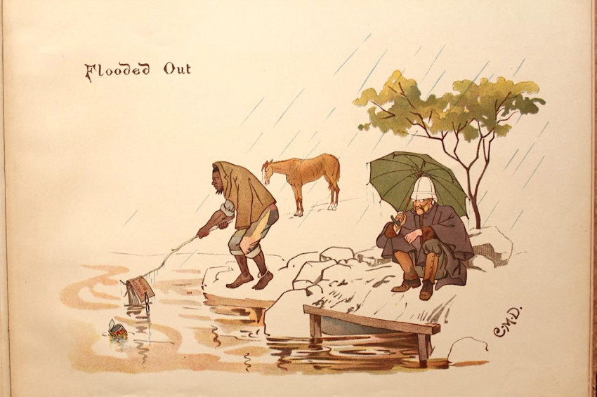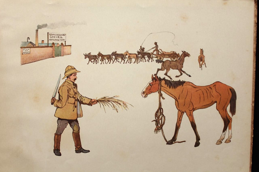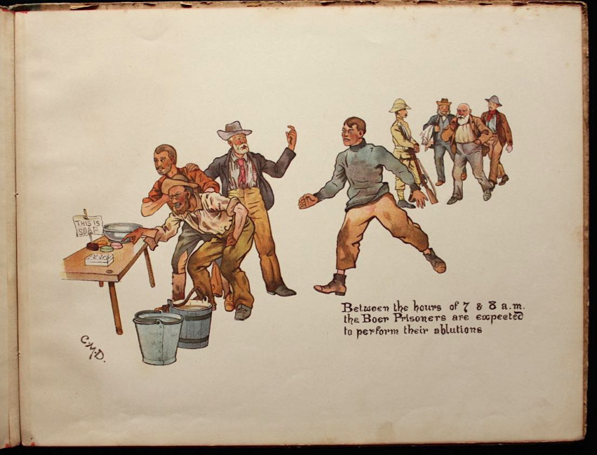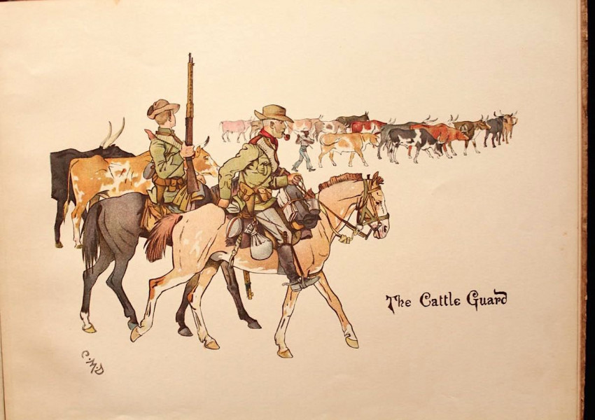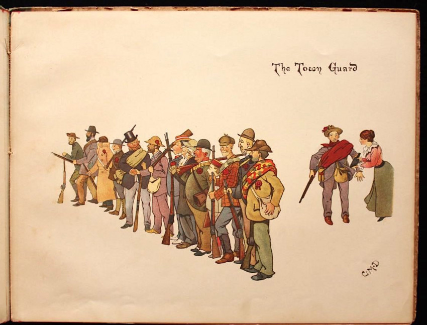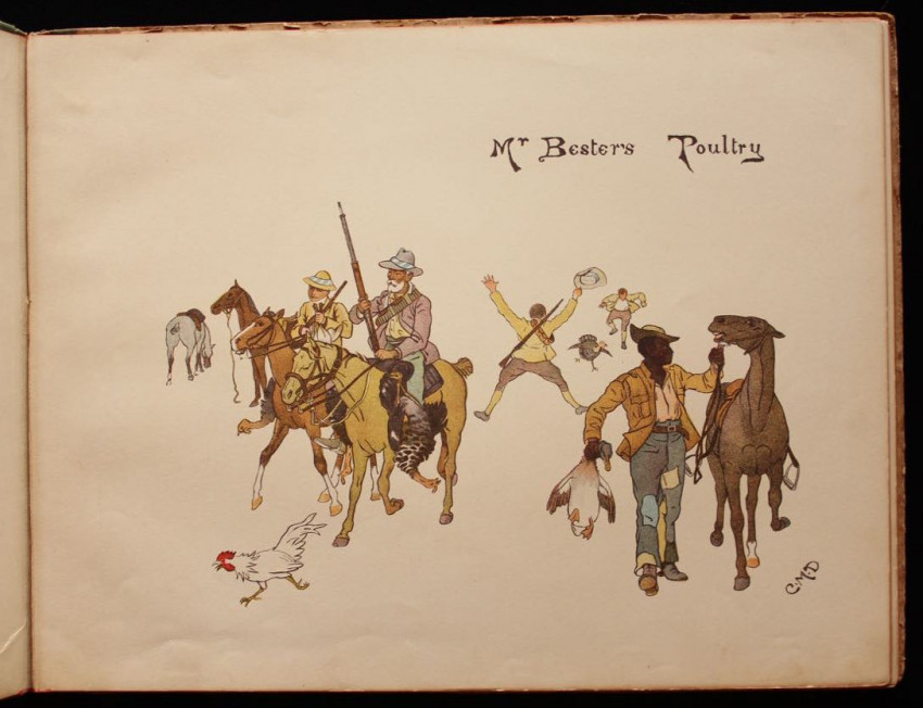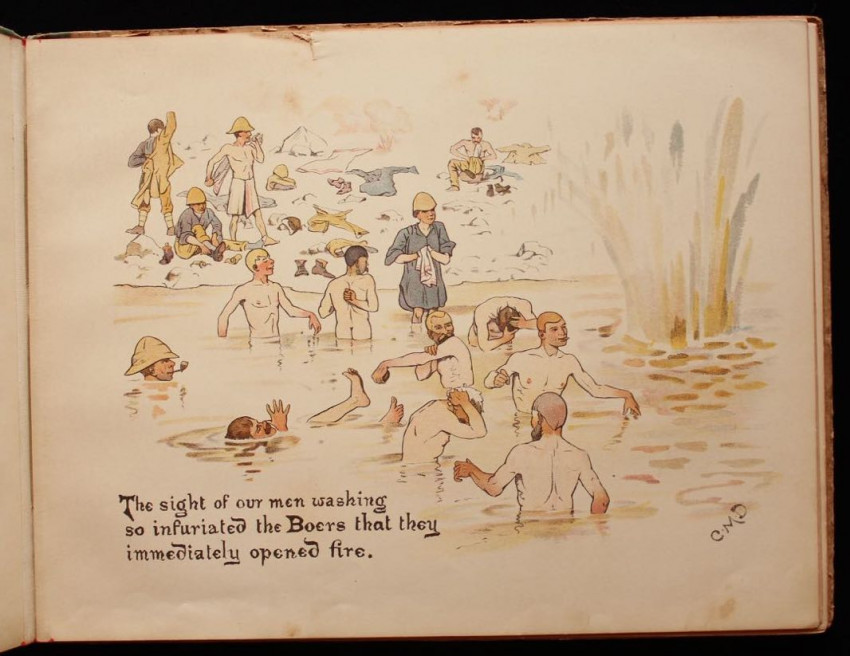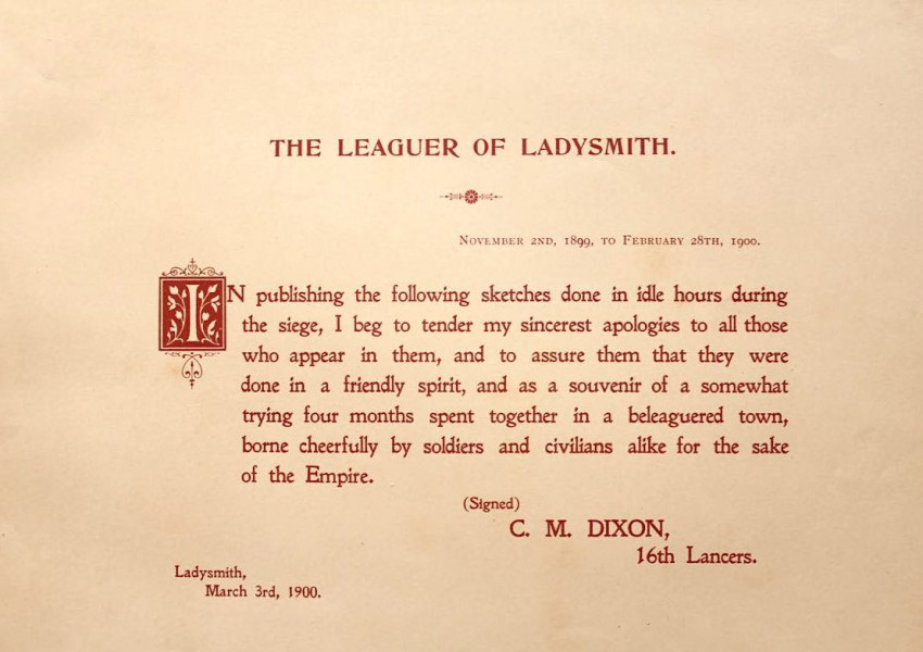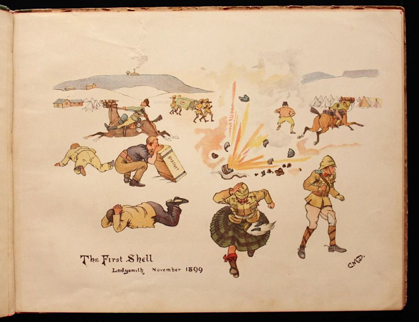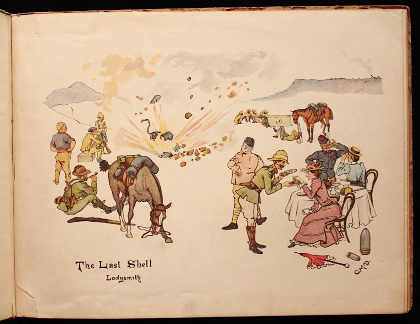 'A collection of spirited and humorous coloured sketches relating to the siege of Ladysmith. The drawings were executed between November 2, 1899, and February 28, 1900, and form an interesting "souvenir of a somewhat trying four months spent together in a beleaguered town, borne cheerfully by soldiers and civilians alike for the sake of the Empire." An amusing letterpress accompanies the sketches.' - Mendelssohn Vol. I, page 474.