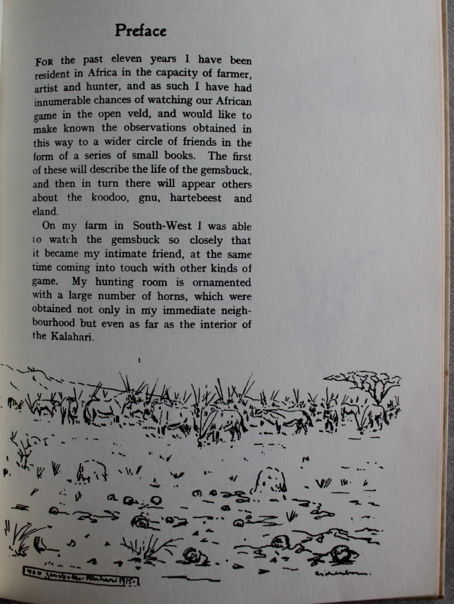 Hans Aschenborn (1888-1931) is widely regarded as the most important pioneer artist of South West Africa (Namibia). He was a multi-faceted artist who also worked as a book illustrator and writer. The Life Story of a Gemsbuck was written and illustrated by Aschenborn.