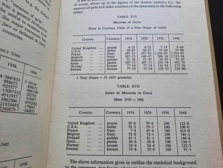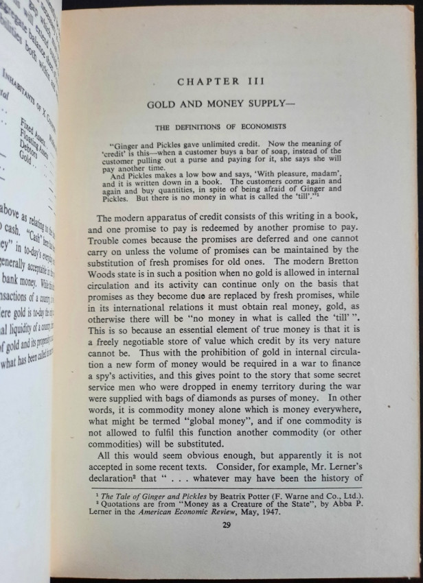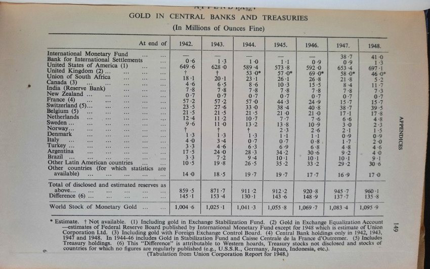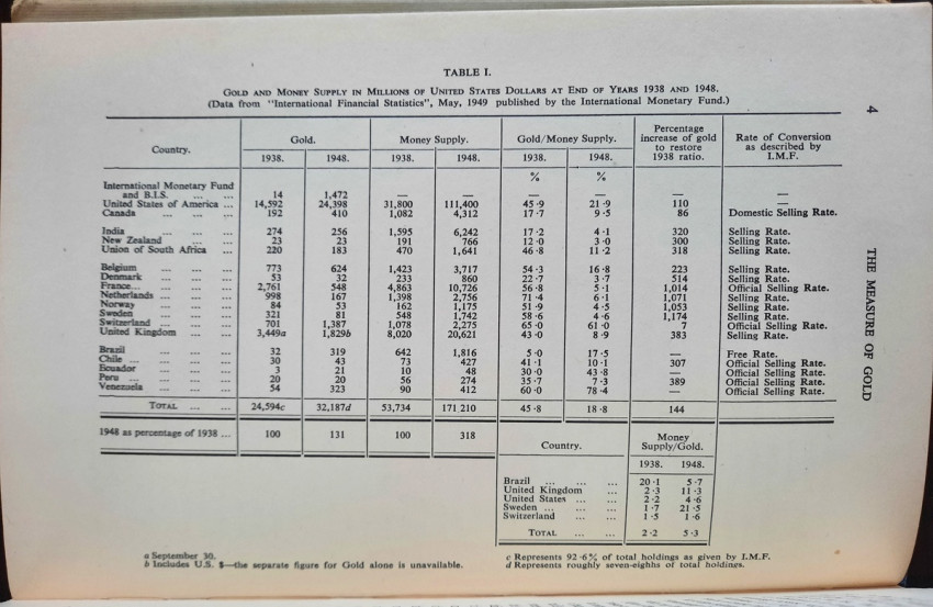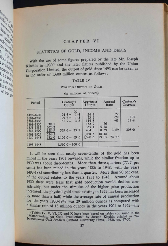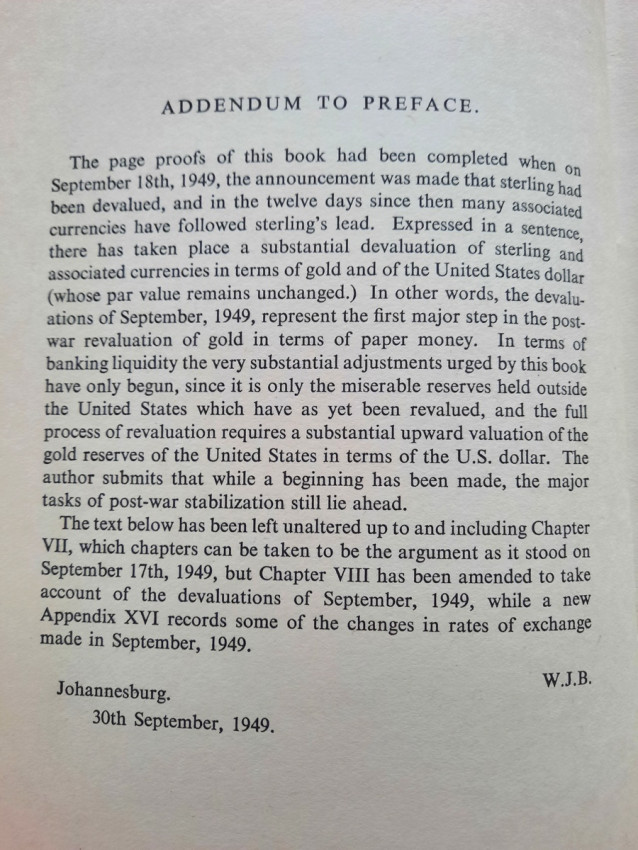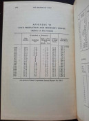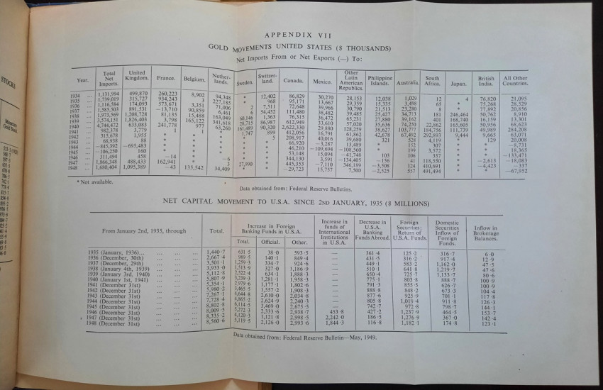 Contains numerous tables, calculations, statisticts, datas, etc. With a two multiple folding tables showing "World Gold Production" from 1929-1948 (Appendix IV) and "Gold Movements United States (Net imports from or net exports to)" from 1934-1948 [with] "Net Capital Movement to U.S.A. since 2nd January, 1935" (Appendix VII). Chapter VII contains sections on International Monetary Fund, The International Bank for Reconstruction and Development, The International Trade Organization, The Anglo-American Loan and The "Marshall Plan" or The European Recovery Programme (E.R.P.).