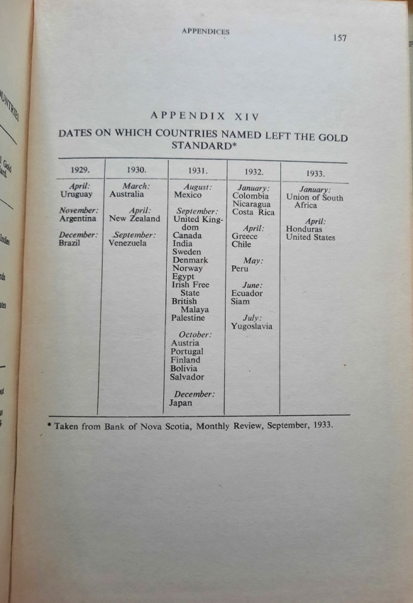 XIV. Dates of departure of countries from the Gold Standard;