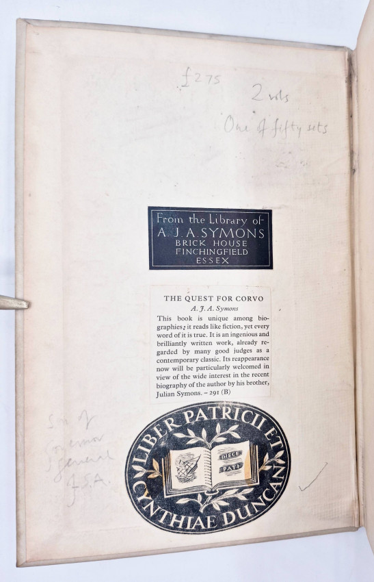 Limited Edition: 2 volumes, printed on Japanese paper, 543 pages continuously paginated, frontispiece portrait in each volume - there are 2 copies of the photogravure portrait in volume 2 of which one is tinted, errata slip (often missing), bound in full vellum with the publisher's device in gilt on the upper covers and gilt titling on the spines, top edges gilt, other edges uncut, with the bookplates of A.J.A. Symons on the front paste down-endpapers, a very good copy.