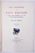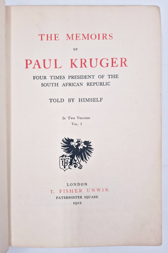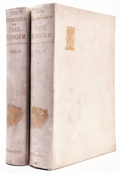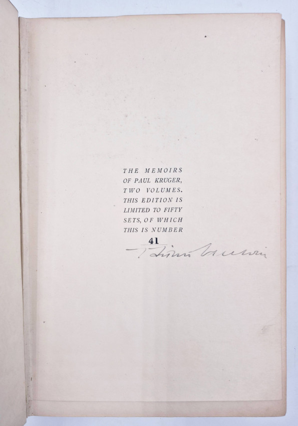 Colophon reads: The Memoirs of Paul Kruger. Two volumes. This edition is limited to fifty sets, of which this is number 41. Signed by the publisher T. Fisher Unwin.