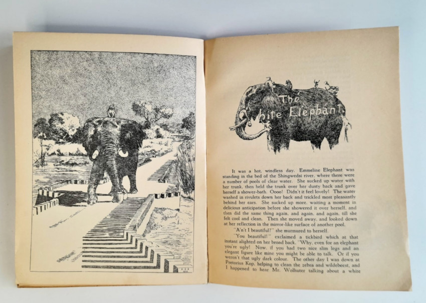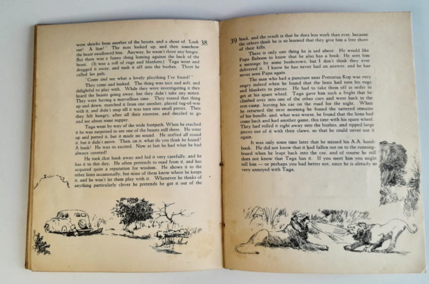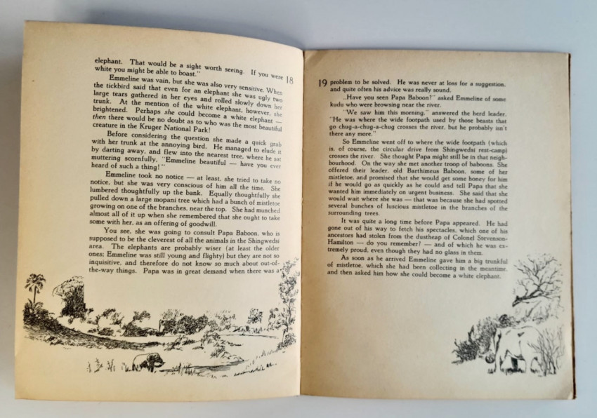 Black and white ink drawings of wildlife throughout the book by Hilda Stevenson-Hamilton. She was the wife of James Stevenson Hamilton, who served from 1902–1946 as the first warden of South Africa's Sabi Nature Reserve, which was expanded under his watch and became Kruger National Park in 1926. She would have lived among and personally studied the animals she illustrated for the book .