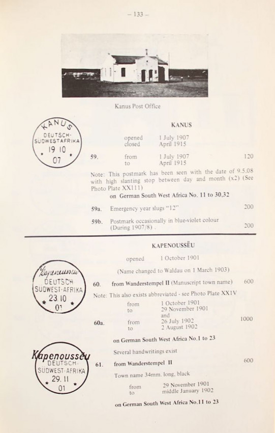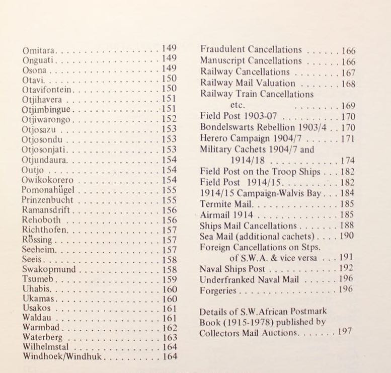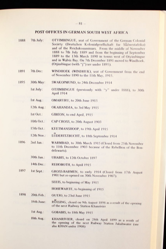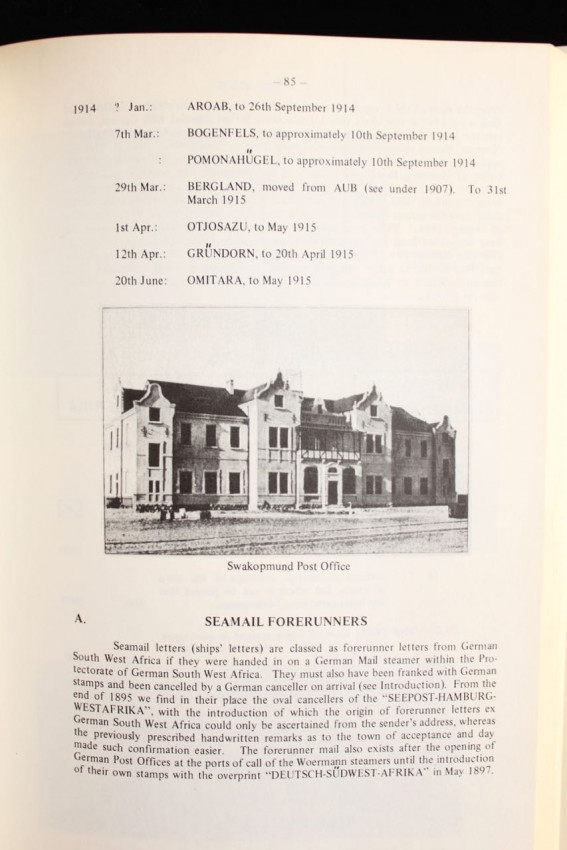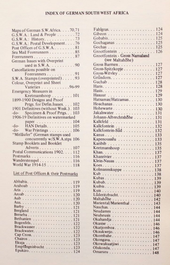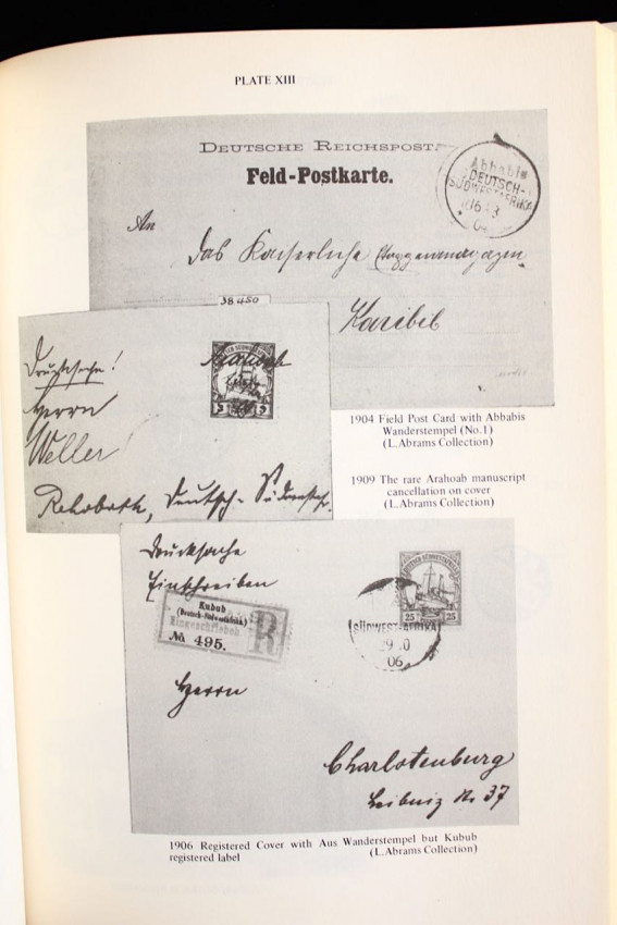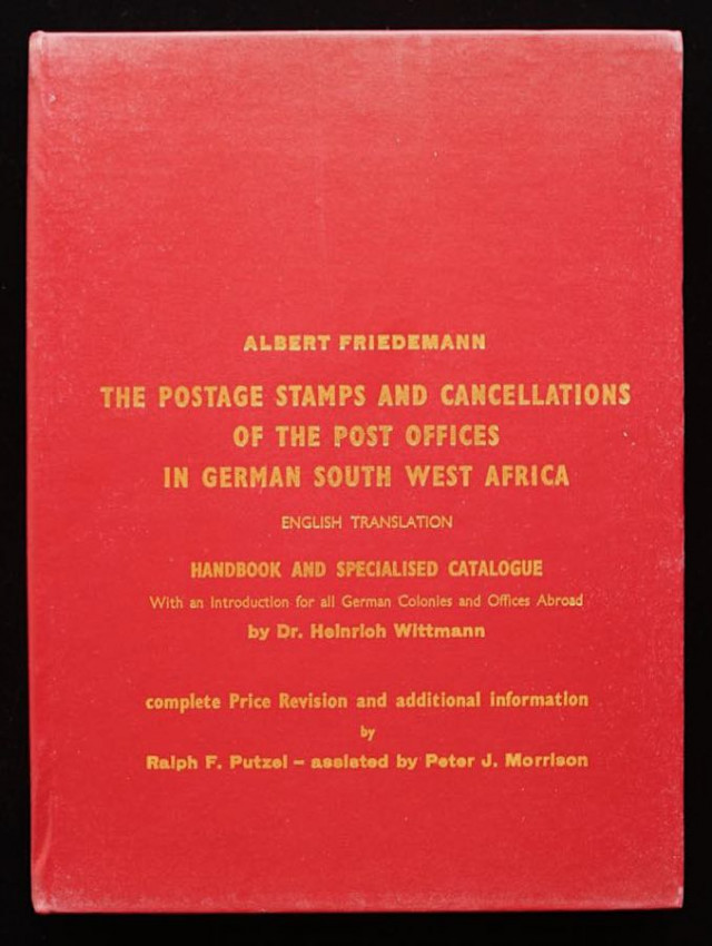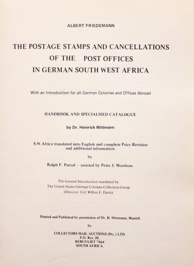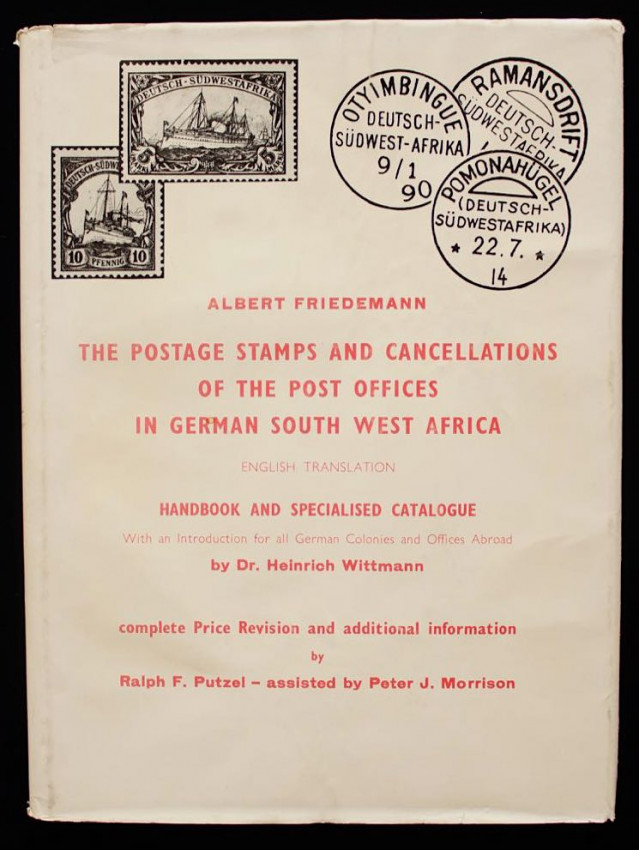 'The Postage Stamps and Cancellations of the Post Offices in German South West Africa. With an Introduction for all German Colonies and Offices Abroad. Handbook and Specialised Catalogue by Dr. Heinrich Wittmann. S.W. Africa translated into English and complete Price Revision and additional information by Ralph F. Putzel - assisted by Peter J. Morrison.'