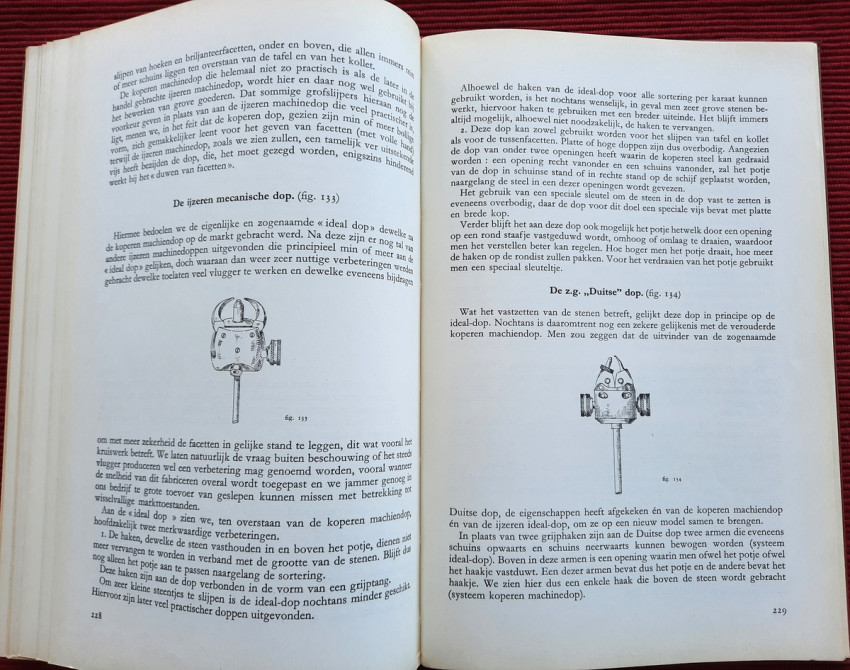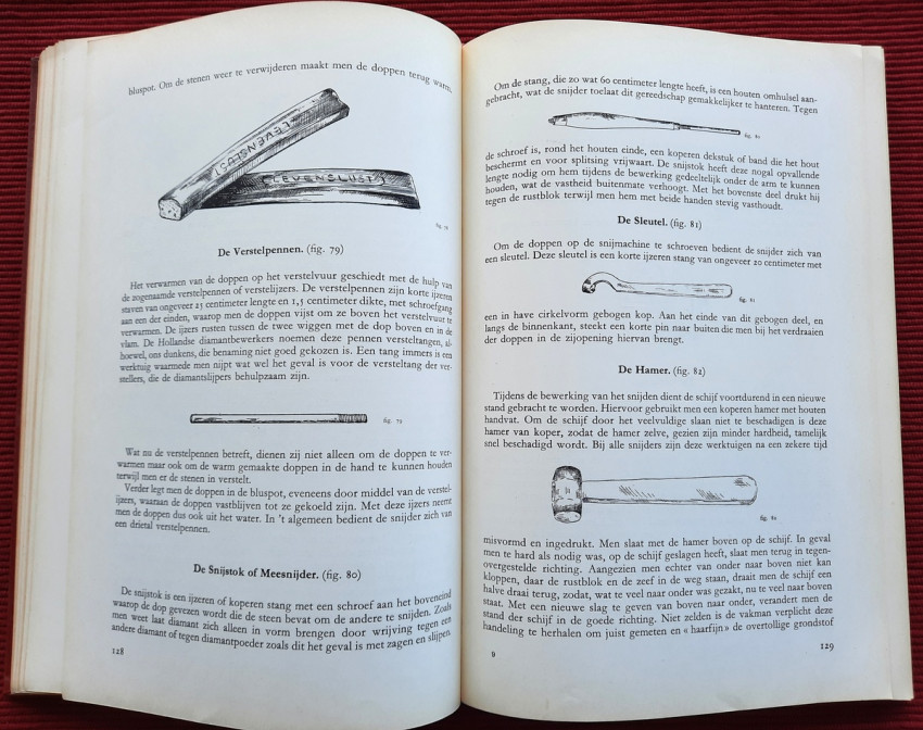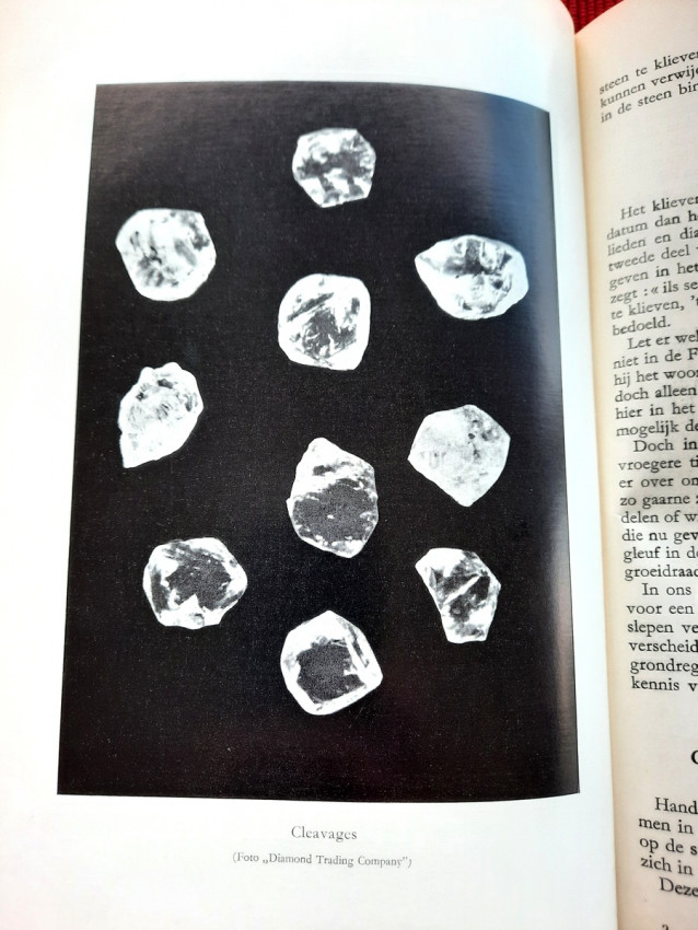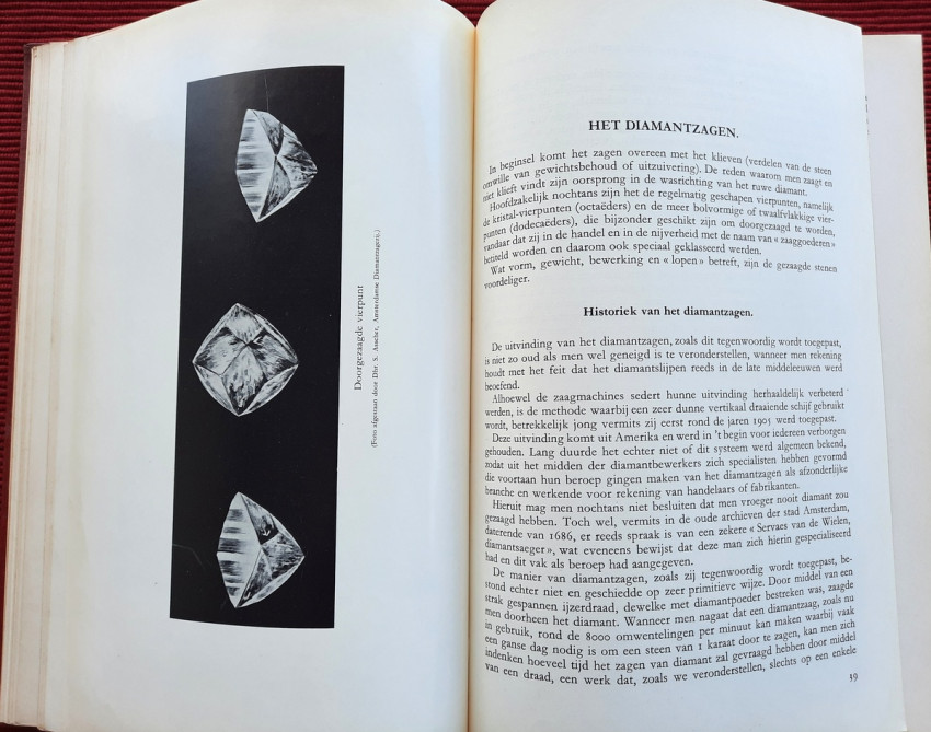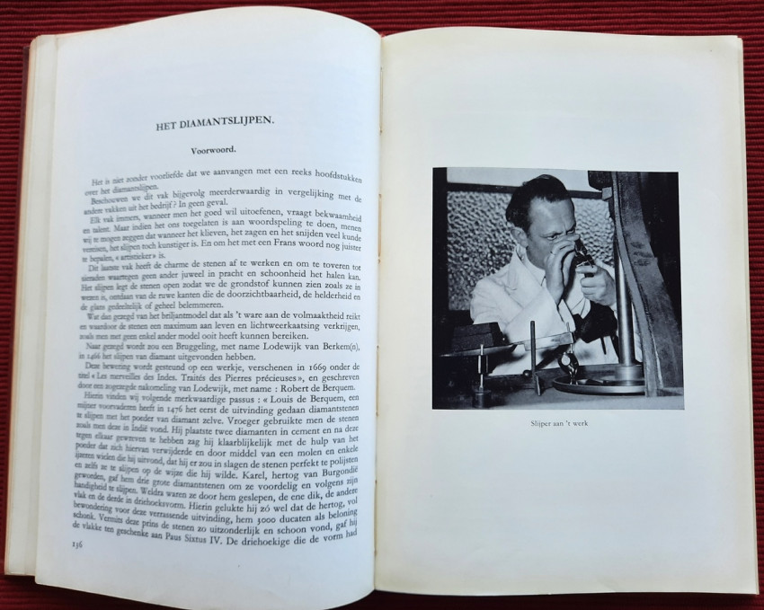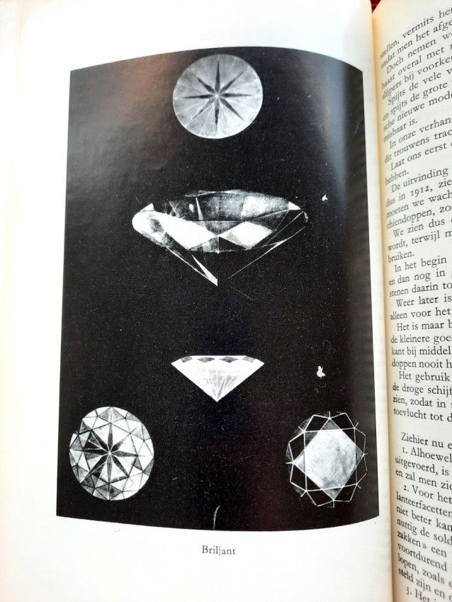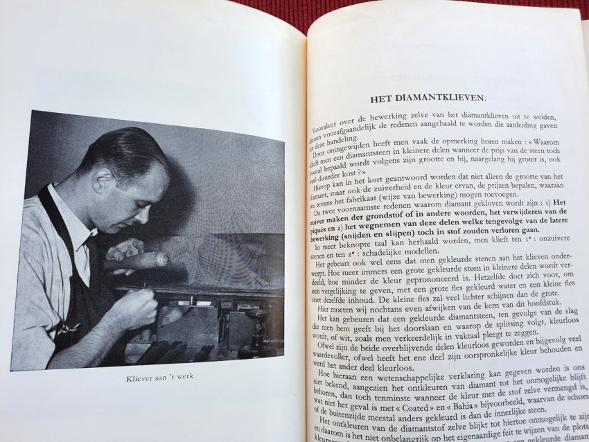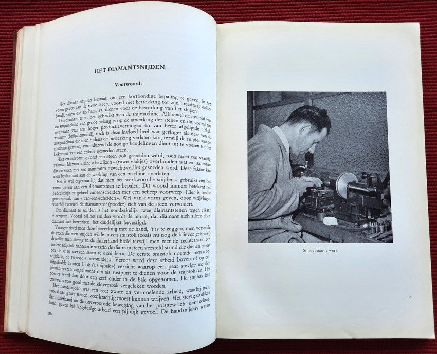 "De bewerking van het diamant."; Original publisher's red hardcovers, gilt lettering; Text in Dutch; Collation complete - Frontispiece, Title page, 272 pages, with 152 in-text illustrations and 20 photographic illustrated plates; A well preserved copy. Binding with a slight shelf wears, but firm, tight and secure, minor bumping mostly to the spine and board's extremities. Content is bright and clean, a few pages with a light fingerprints, othervise no foxing or markings, only negligible yellowing to the white margins.
