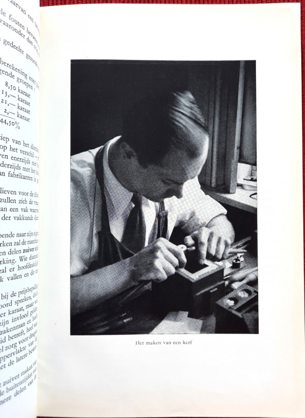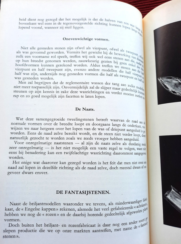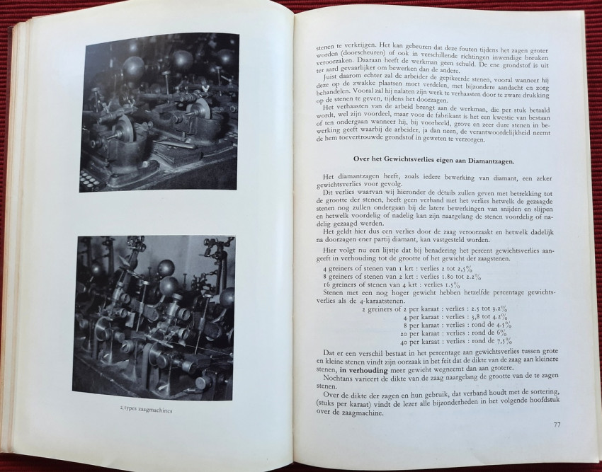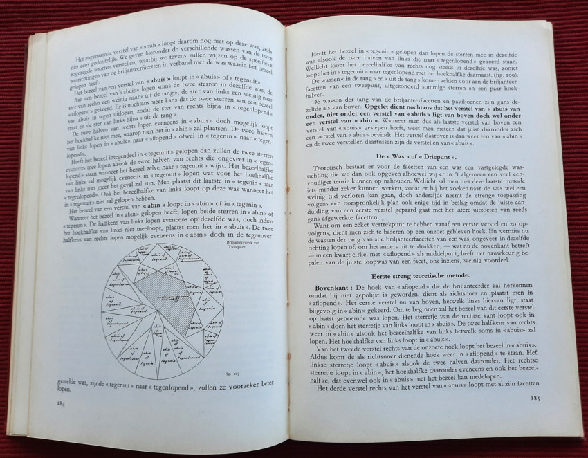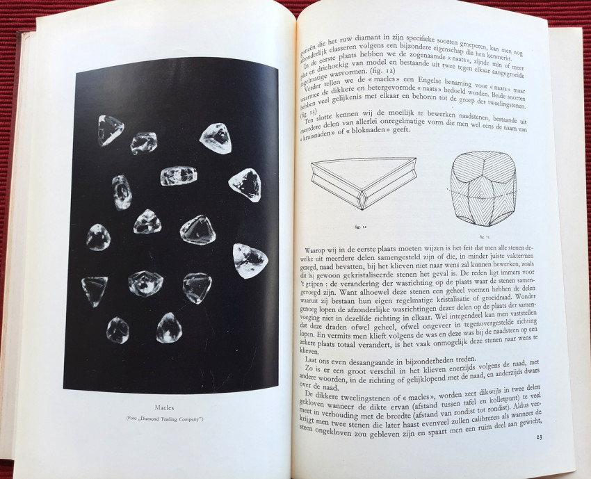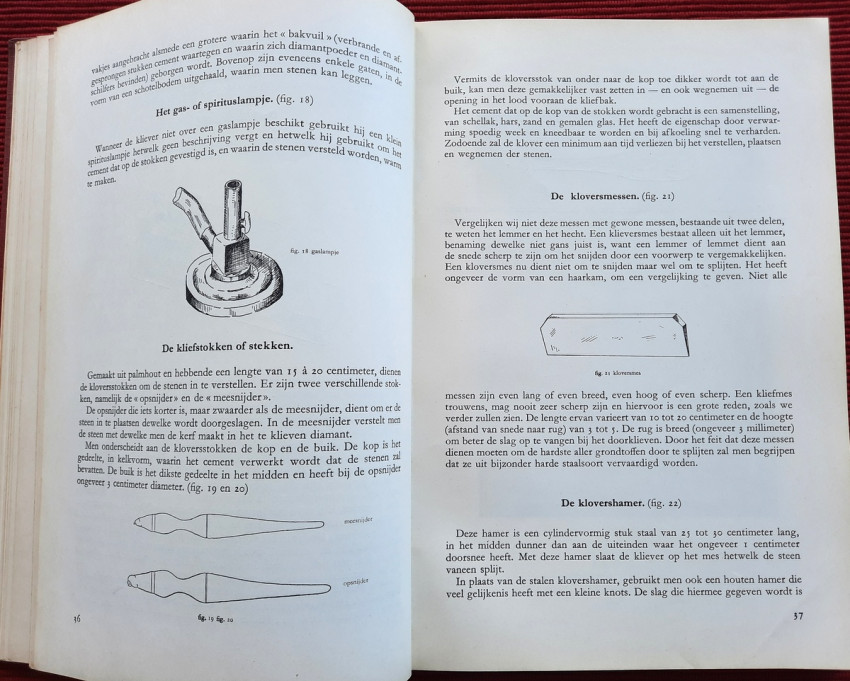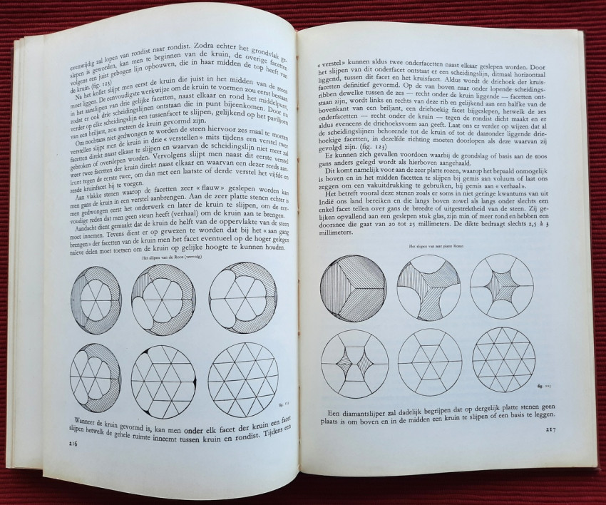 "De bewerking van het diamant."; Original publisher's red hardcovers, gilt lettering; Text in Dutch; Collation complete - Frontispiece, Title page, 272 pages, with 152 in-text illustrations and 20 photographic illustrated plates; A well preserved copy. Binding with a slight shelf wears, but firm, tight and secure, minor bumping mostly to the spine and board's extremities. Content is bright and clean, a few pages with a light fingerprints, othervise no foxing or markings, only negligible yellowing to the white margins.