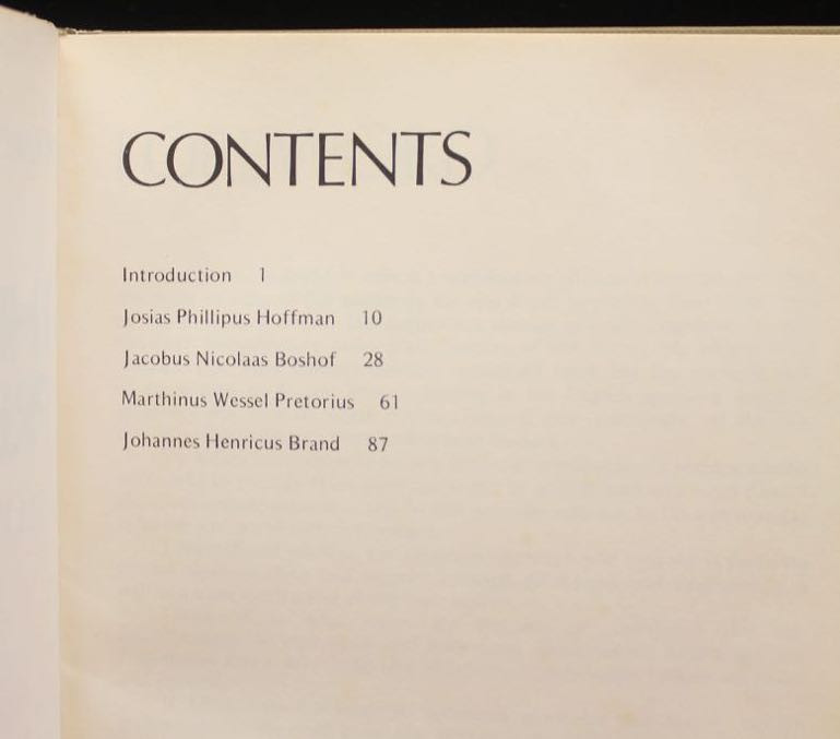 Includes the biographies of Josias Phillipus Hoffman, Jacobus Nicolaas Boshof, Marthinus Wessel Pretorius, Johannes Henricus Brand.