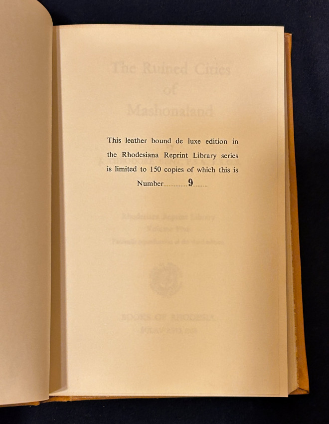 427 pages. Leather-bound, boxed. 150 sets of the Gold Series were produced, this book is numbered #9. Volume 5 of the Rhodesia Reprint Gold Series published by Books of Rhodesia in 1969. In exceptionally good condition.