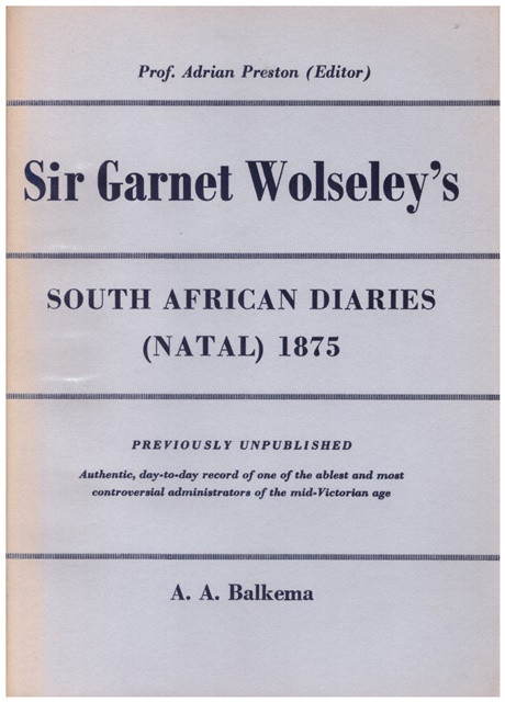 Volume 1: THE SOUTH AFRICAN DIARIES [NATAL] OF SIR GARNET WOLSELEY, 1875; x, 293 pages: illustrations, portraits. (South African biographical & historical studies; number 11). Skivertex spine & paper covered boards, dust wrapper browned on spine. "Authentic day-to-day record of one of the ablest and most controversial administrators of the mid-Victorian age". Front cover.