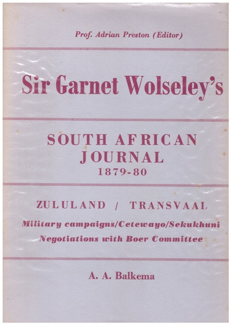 Volume 2: THE SOUTH AFRICAN JOURNAL [ZULULAND / TRANSVAAL] OF SIR GARNET WOLSELEY, 1879-1880; viii, 359 pages: illustrations, portraits. (South African biographical & historical studies; number 12). Skivertex spine & paper covered boards, dust wrapper browned on spine. "Military campaigns / Cetewayo / Sekukhuni / Negotiations with Boer Committee" Front cover.